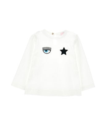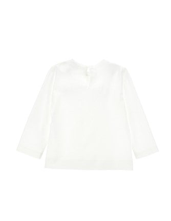 T-Shirt mit Rundhalsausschnitt, langen Ärmeln, gesticktem Symbol auf der Vorderseite und Knopfverschluss auf der Rückseite.
