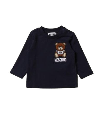 Langärmliges T-Shirt mit Rundhalsausschnitt, aufgesticktem Logo und Symbol auf der Vorderseite und Druckknopfverschluss an der Schulter.