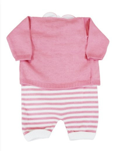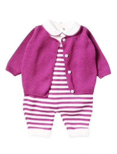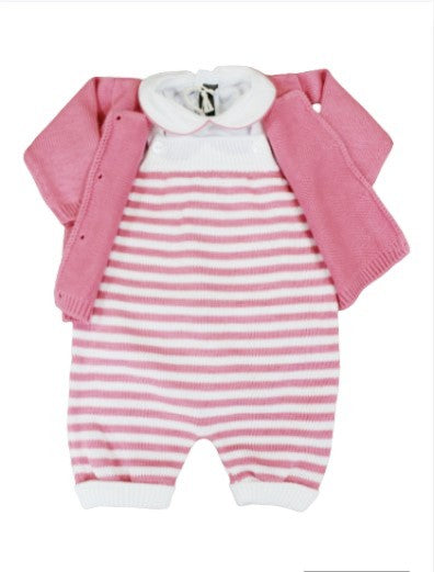 Kurzarm-Body; gestreifter gemusterter Strampler mit Hosenträgern; Garnjacke.