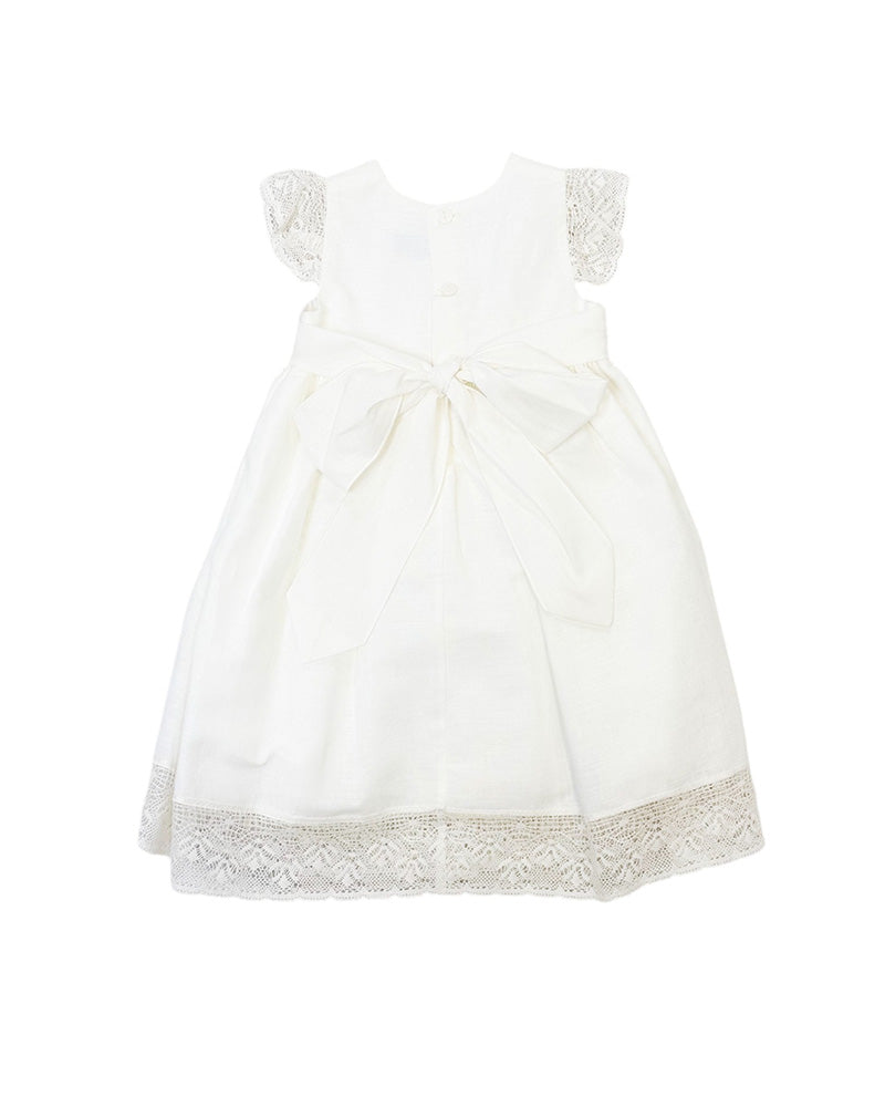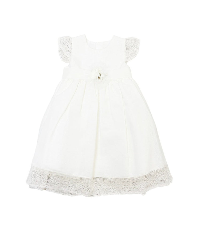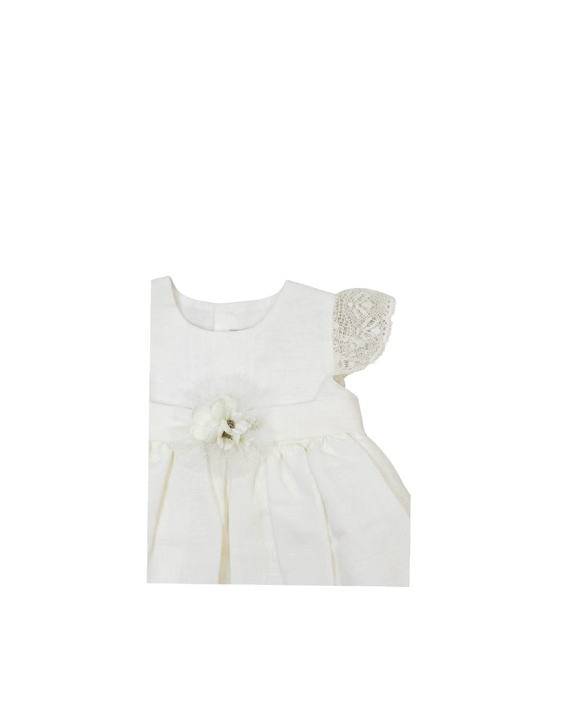 vestina cerimonia in misto lino senza collo maniche a aletta e orlo in pizzo cintura in vita con fiore