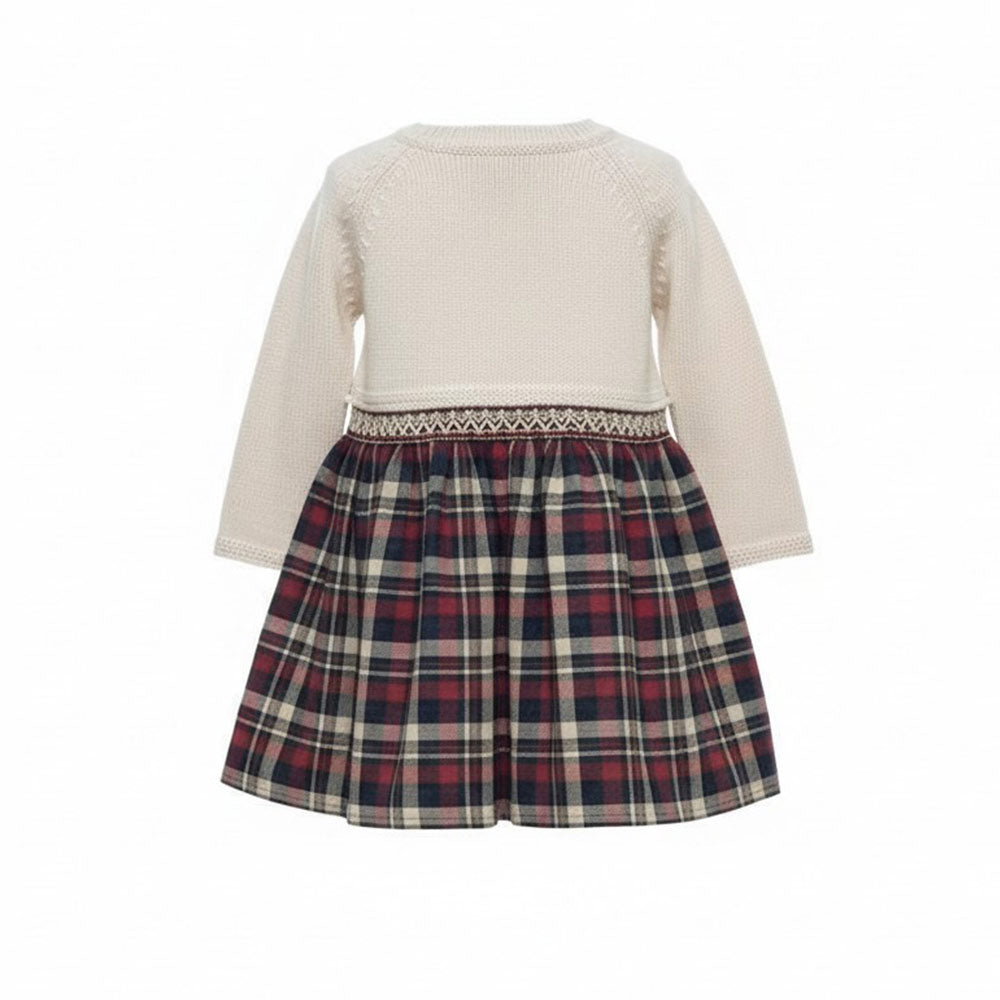 Vestina realizzata in misto lana e flanella, caratterizzata da colletto rotondo a costine, maniche lunghe e gonna svasata a quadri. È decorata con osetto ad intasrio sulla parte anteriore.