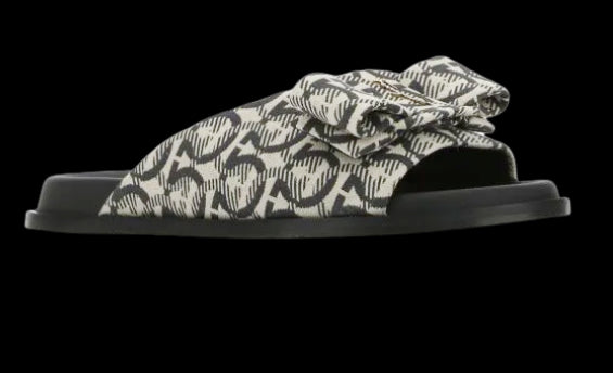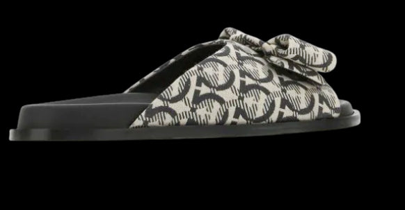 Salvatore Ferragamo-Slipper aus beigem Stoff mit schwarzen Logos.