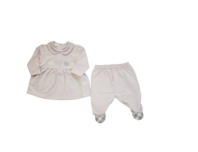 Zweiteiliger Ninnaoh-Strampler mit aufgenähten Herzen auf der Vorderseite.