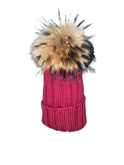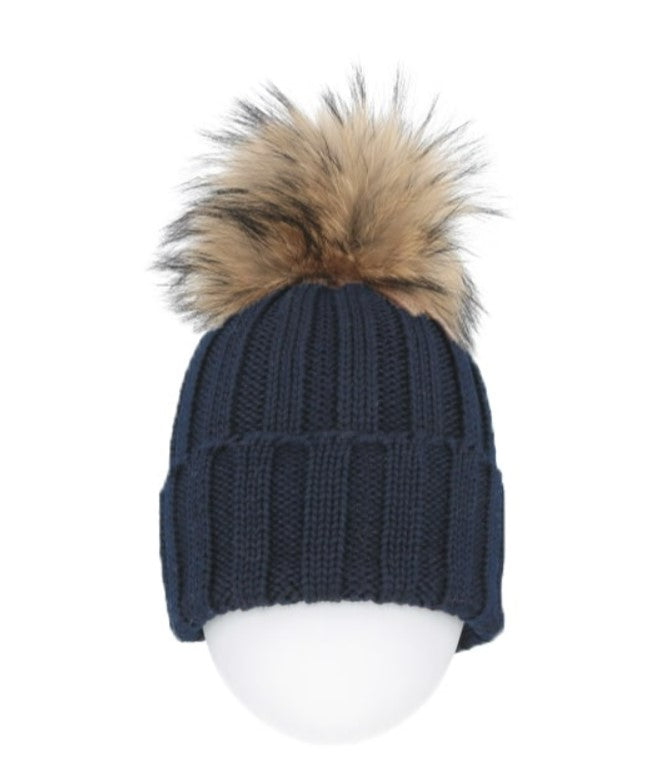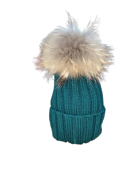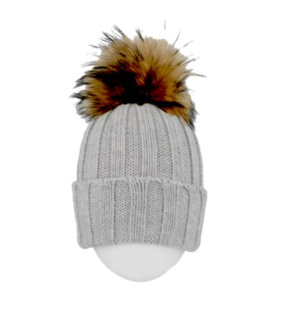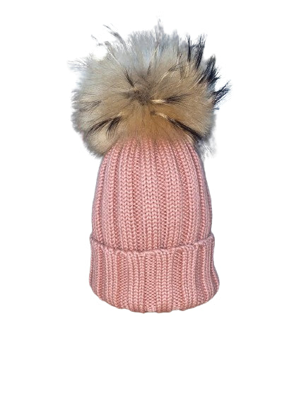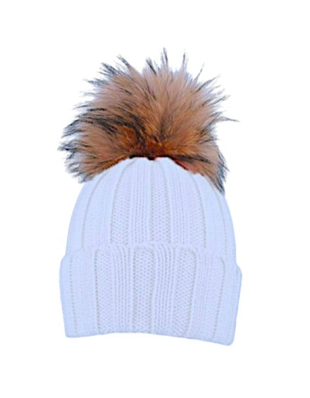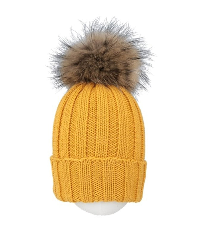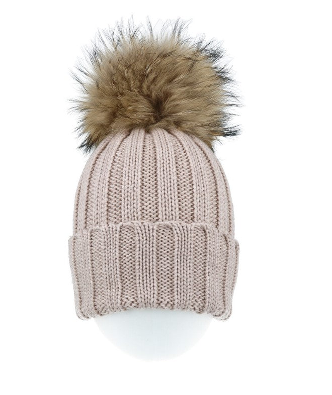 Gerippte Wollmütze mit natürlichem Murmasky-Fellbommel.