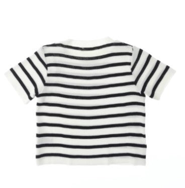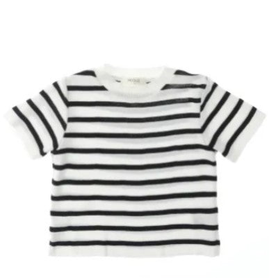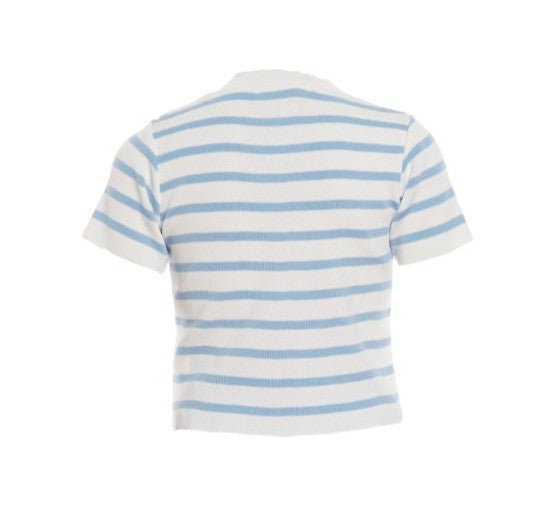 Mädchen-T-Shirt aus Baumwollgarn mit kurzen Ärmeln, durchgehendem Streifenmuster, geripptem Rundkragen und geradem Saum.