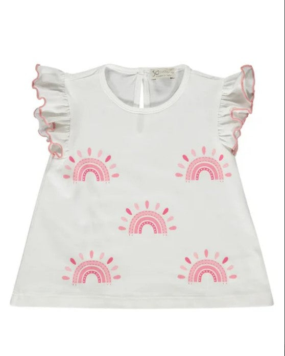 Kurzärmliges T-Shirt mit Rundhalsausschnitt, Rüschen, Aufdruck auf der Vorderseite und Verschluss auf der Rückseite.