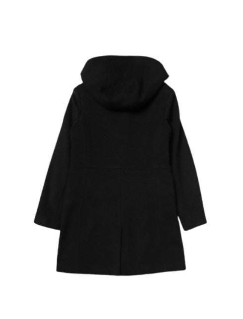Mantel mit Kapuze, aufgesetzter Tasche, Hakenverschluss.