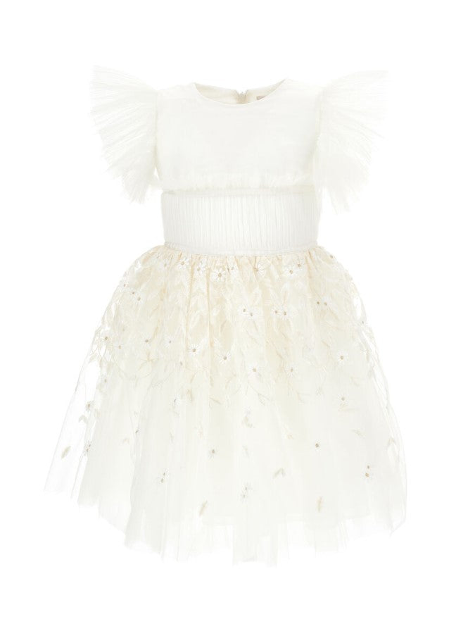 Kleid mit weitem Tüllrock mit Applikationen, einfarbigem Oberteil, Ärmeln mit Rüschen.