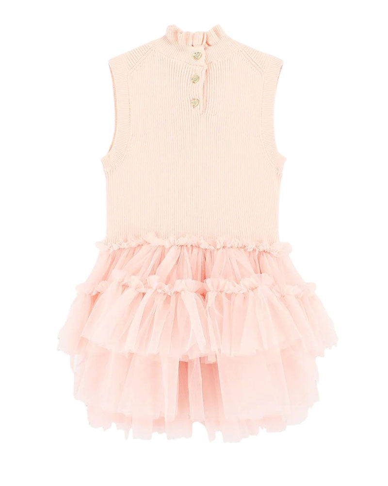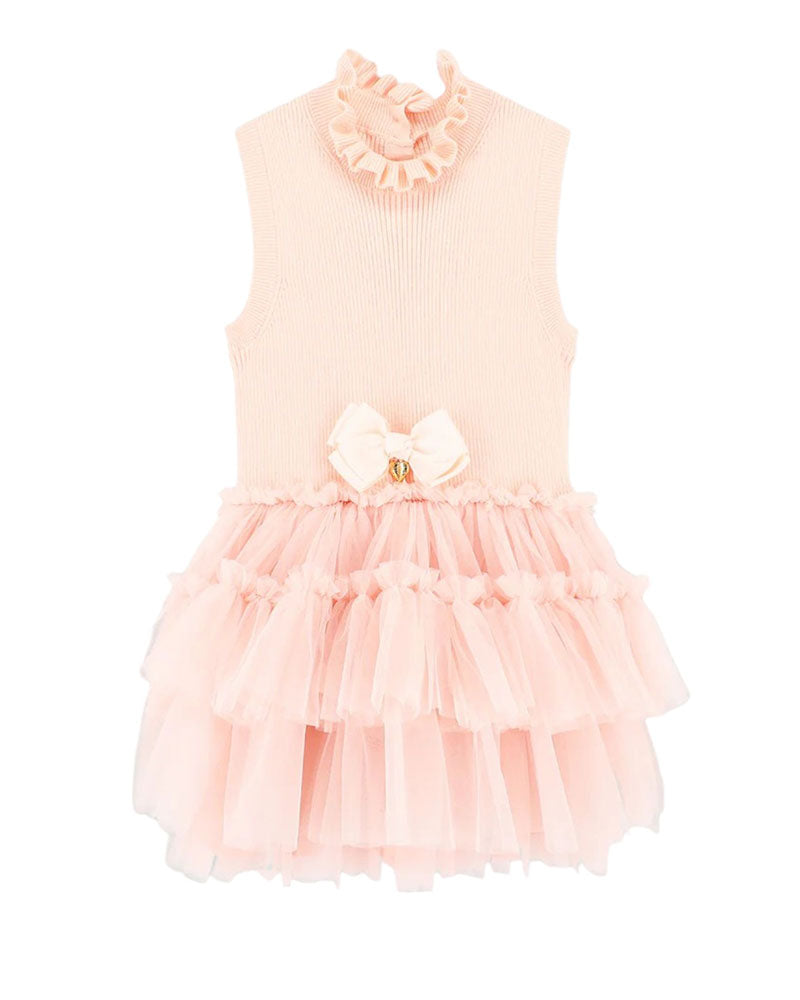 Abito senza maniche con corpetto in costina di cotone con collo con ruches, vita bassa con gonna in morbido tulle a balze, fiocco e dettaglio in metallo oro applicato in vita.
