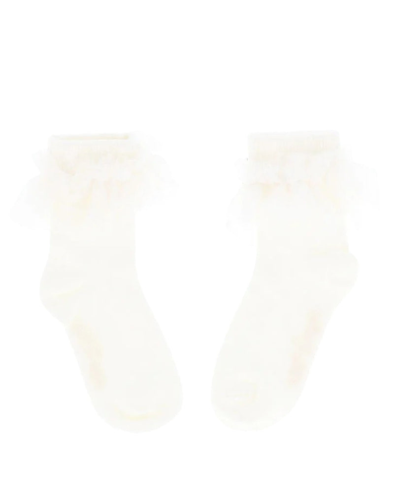 Calzettoni alla caviglia in cotone, ruches in tulle tono su tono applicata.