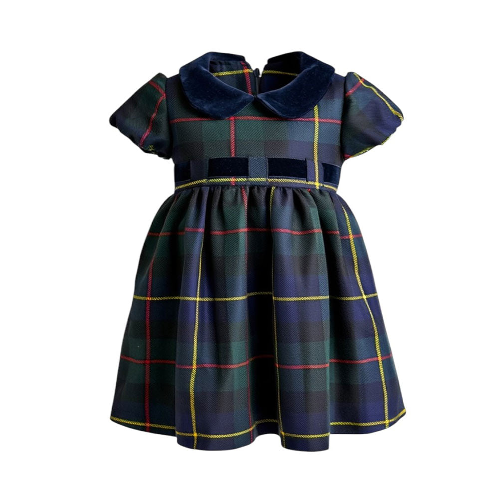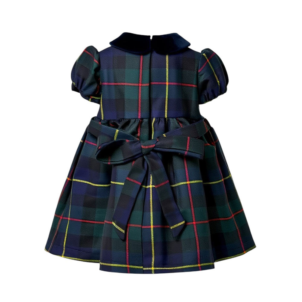 Vestina realizzata in lana, con fantasia tartan e dettagli in velluto. Presenta colletto alla Peter Pan, maniche corte a palloncino e chiusura posteriore nascosta con zip. È decorata con fiocco applicato sul retro.