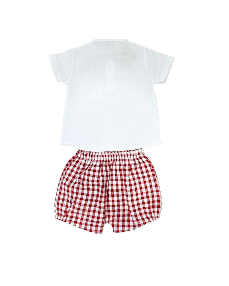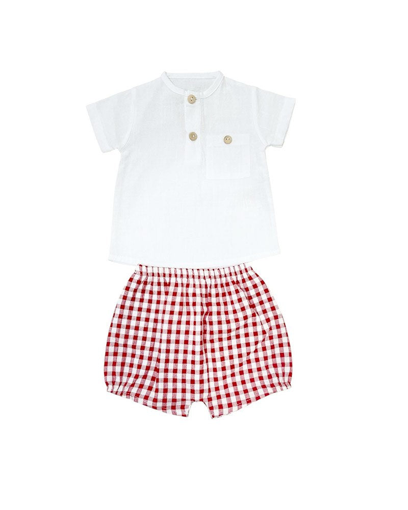 camicia manica corta in misto lino senza collo e bottoncini in finto legno sul davanti