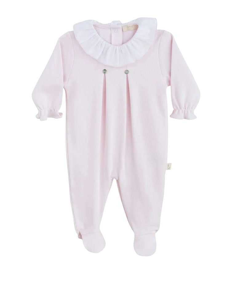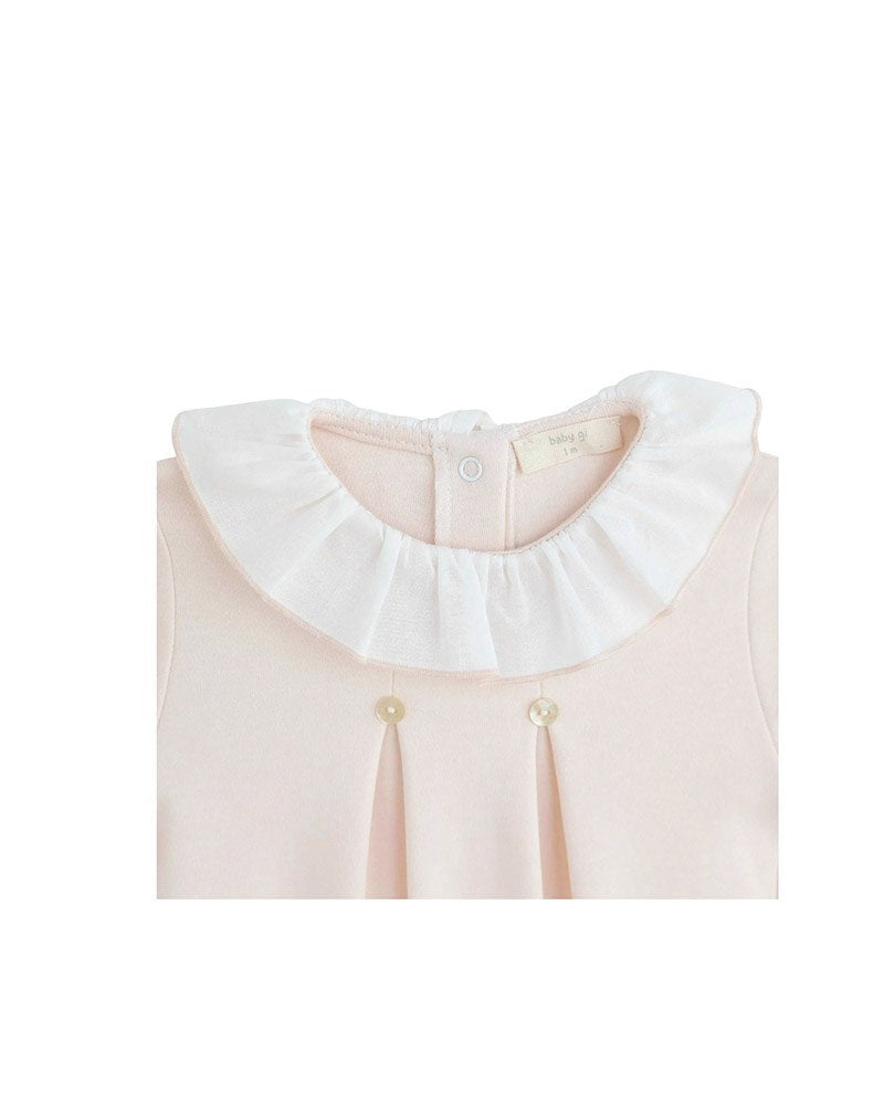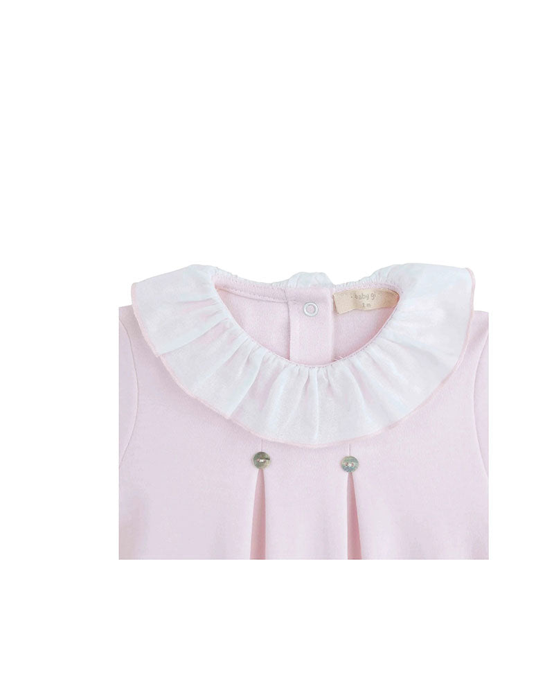 Tutina in puro cotone con bottoncini in madreperla e collo rouches con bordino a contrasto