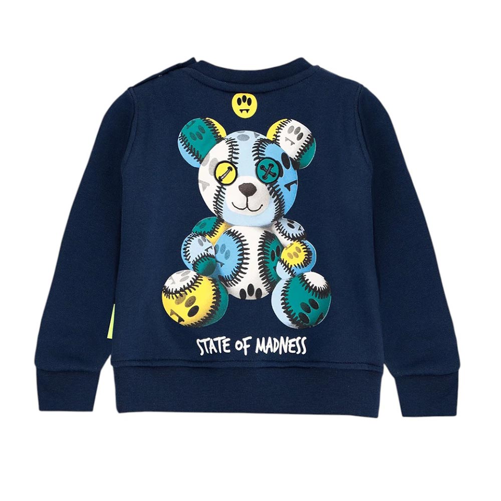 Felpa realizzata in cotone garzato, caratterizzata da collo rotondo, maniche lunghe, chiusura con bottoncini a pressione sulla spalla, fodera in pile e finiture a costine. È decorata con stampa sulla parte anteriore e con stampa Teddy sul retro.