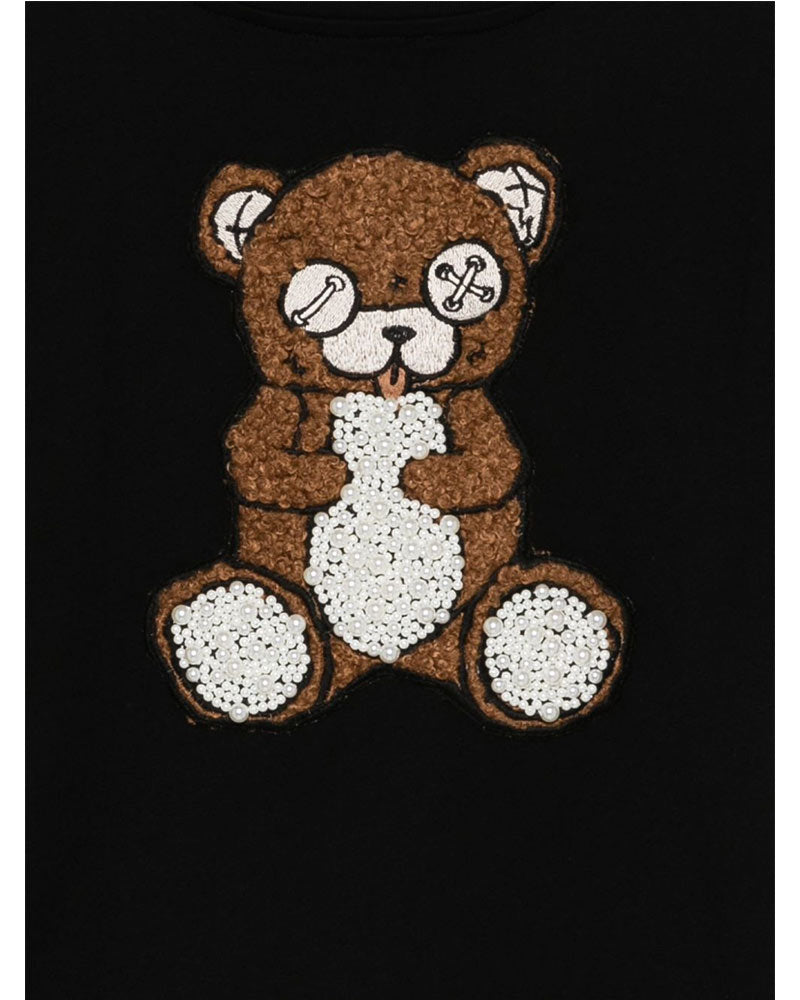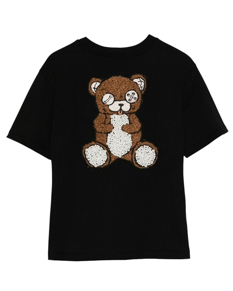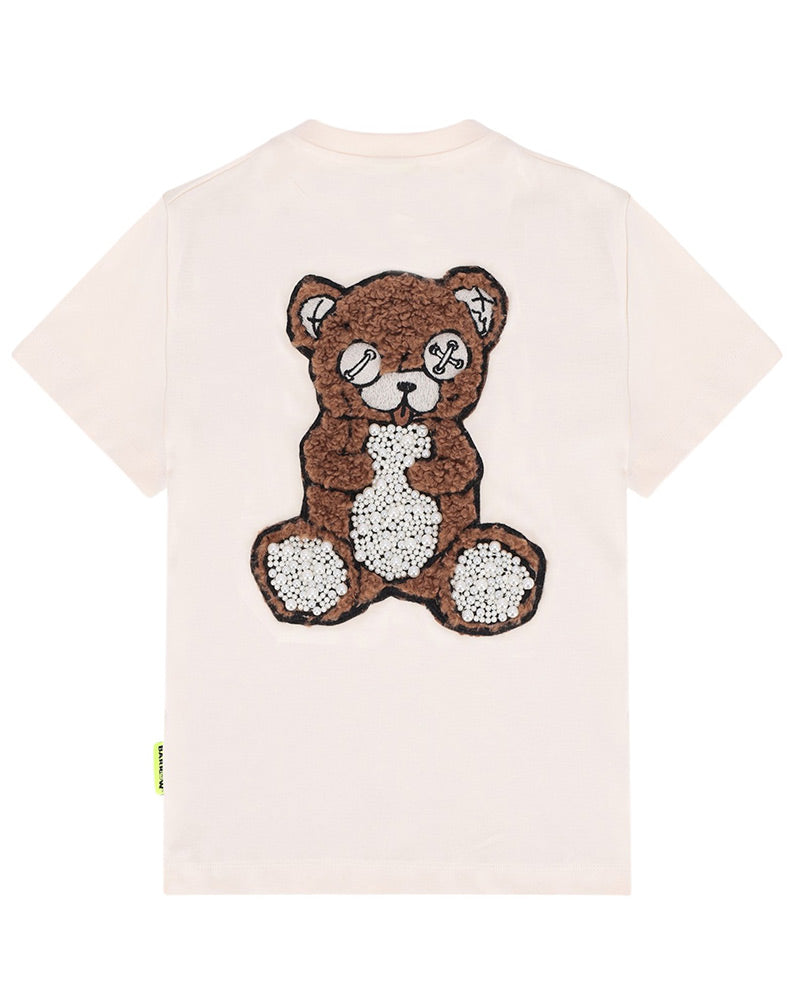 T-shirt realizzata in jersey di cotone, caratterizzata da collo tondo a costine, maniche corte e orlo dritto. È decorata con stampa logo e smile sulla parte anteriore e con patch Bear in shearling applicato sulla parte posteriore.