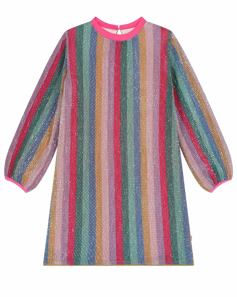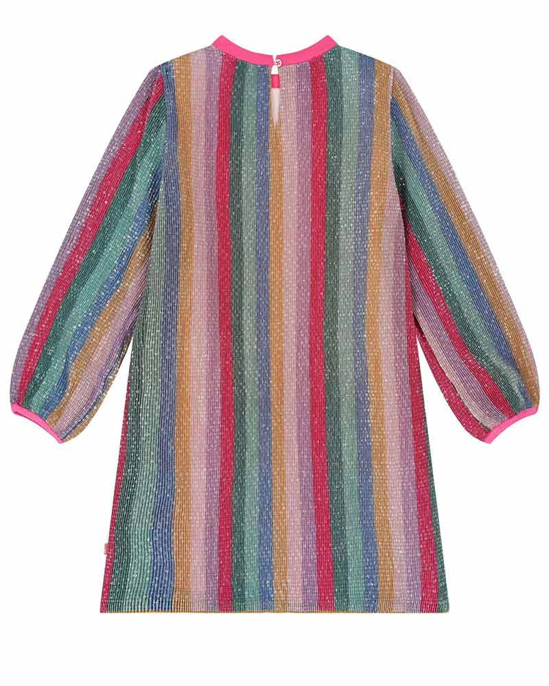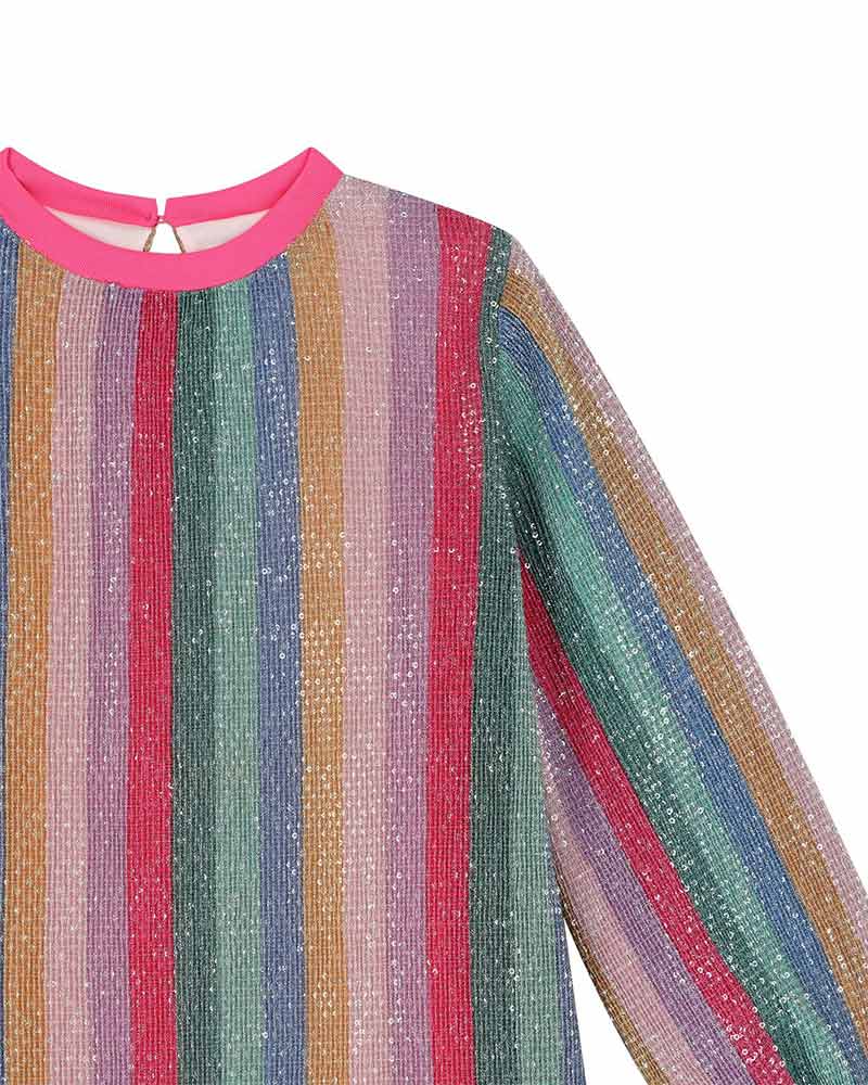 Abito arcobaleno da bambina, realizzato in tessuto elasticizzato, con motivo a nido d'ape multicolore impreziosito da paillettes trasparenti. Presenta colletto tondo, maniche lunghe, fodera in jersey, chiusura sul retro con bottoncino e finiture a coste.