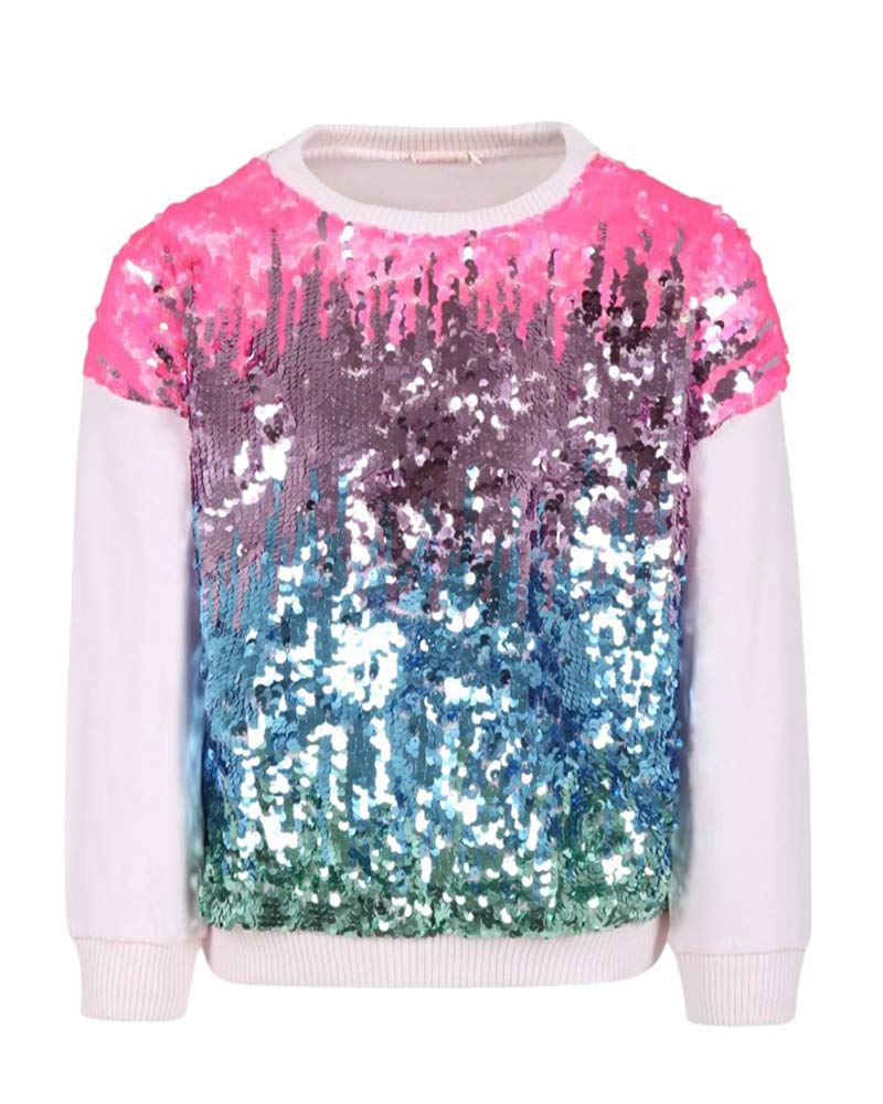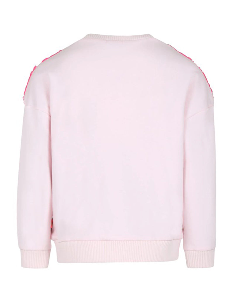 Felpa rosa da bambina realizzata in cotone sgarzato. Presenta collo tondo, maniche lunghe e finiture a coste. È decorata con paillettes sulla parte anteriore.