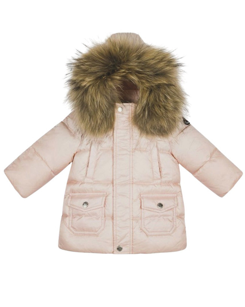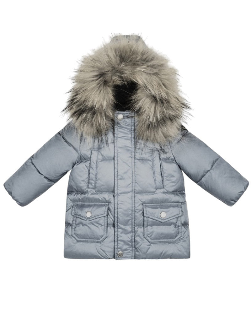 3-Feder-Jacke, feste Kapuze, abnehmbarer Echtpelz, Reißverschluss und Clipverschluss, Taschen mit Klappen.