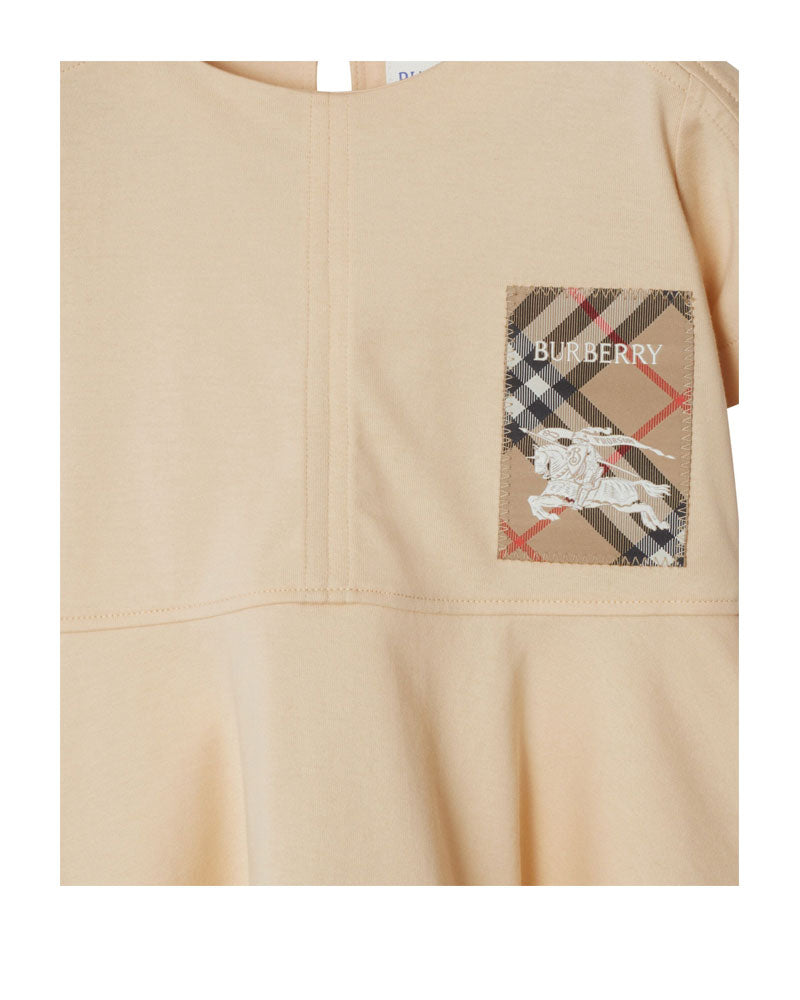Vestina girocollo a maniche corte in jersey di cotone con gonna svasata. Il modello presenta un'applicazione intessuta con Burberry Check sul davanti, chiusura con bottoni sul retro.