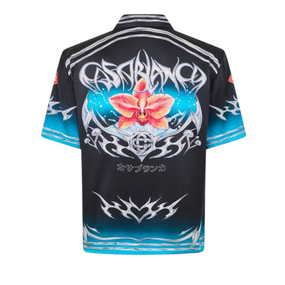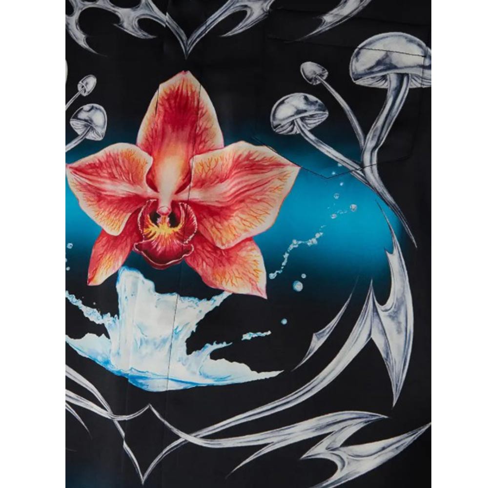 Camicia realizzata in raso di seta, caratterizzata da colletto cubano, chiusura frontale con bottoni, maniche corte, orlo dritto e dettagli a righe su colletto, polsini e orlo. È decorata con stampa opera d'arte che gioca sul contrasto tra due sensazioni opposte: la lama affilata e il freddo cromo argentato, in contrasto con il calore della natura, come le intense tonalità rosa e rosse di un fiore di orchidea. L'aggiunta di acqua conferisce un tocco fresco e frizzante al design.