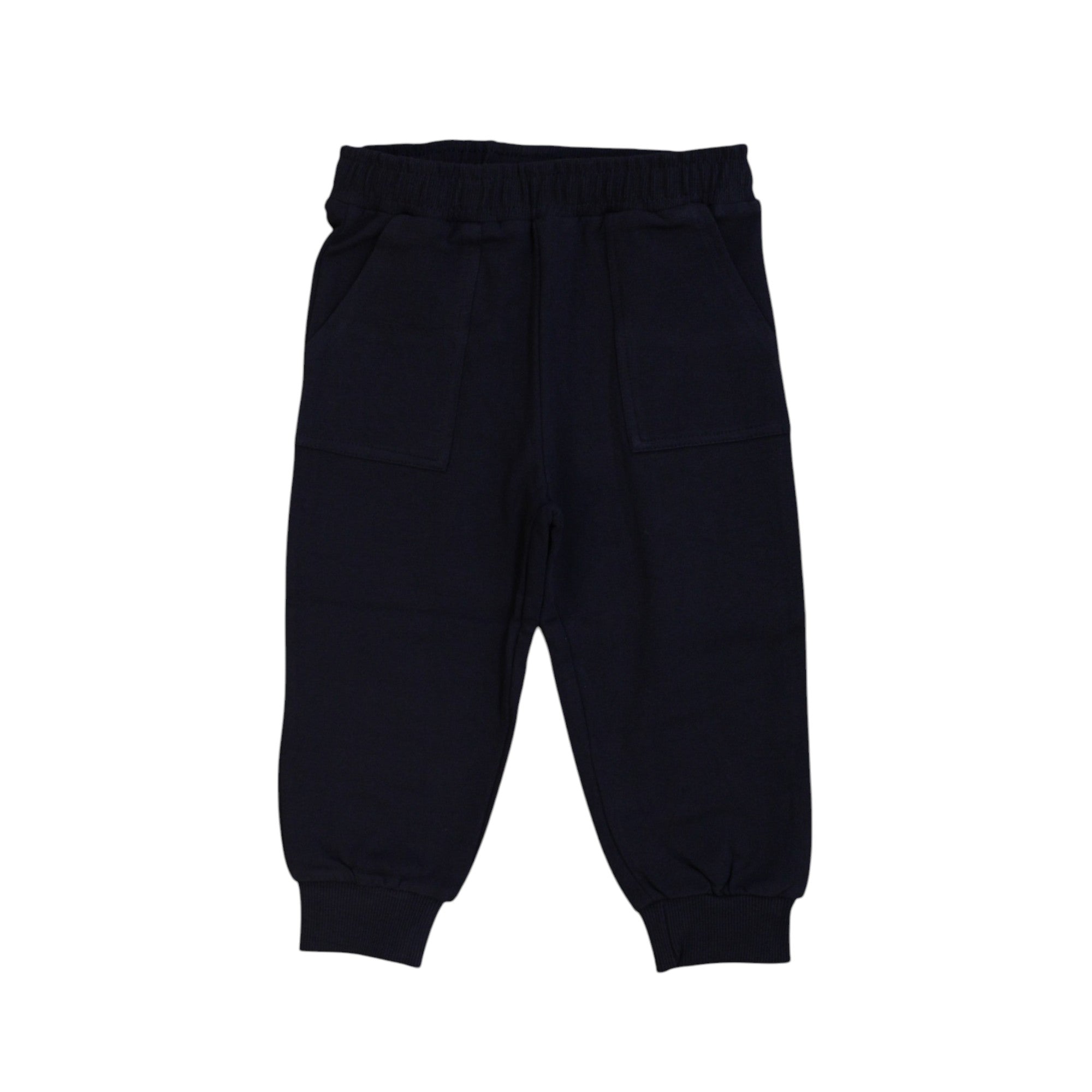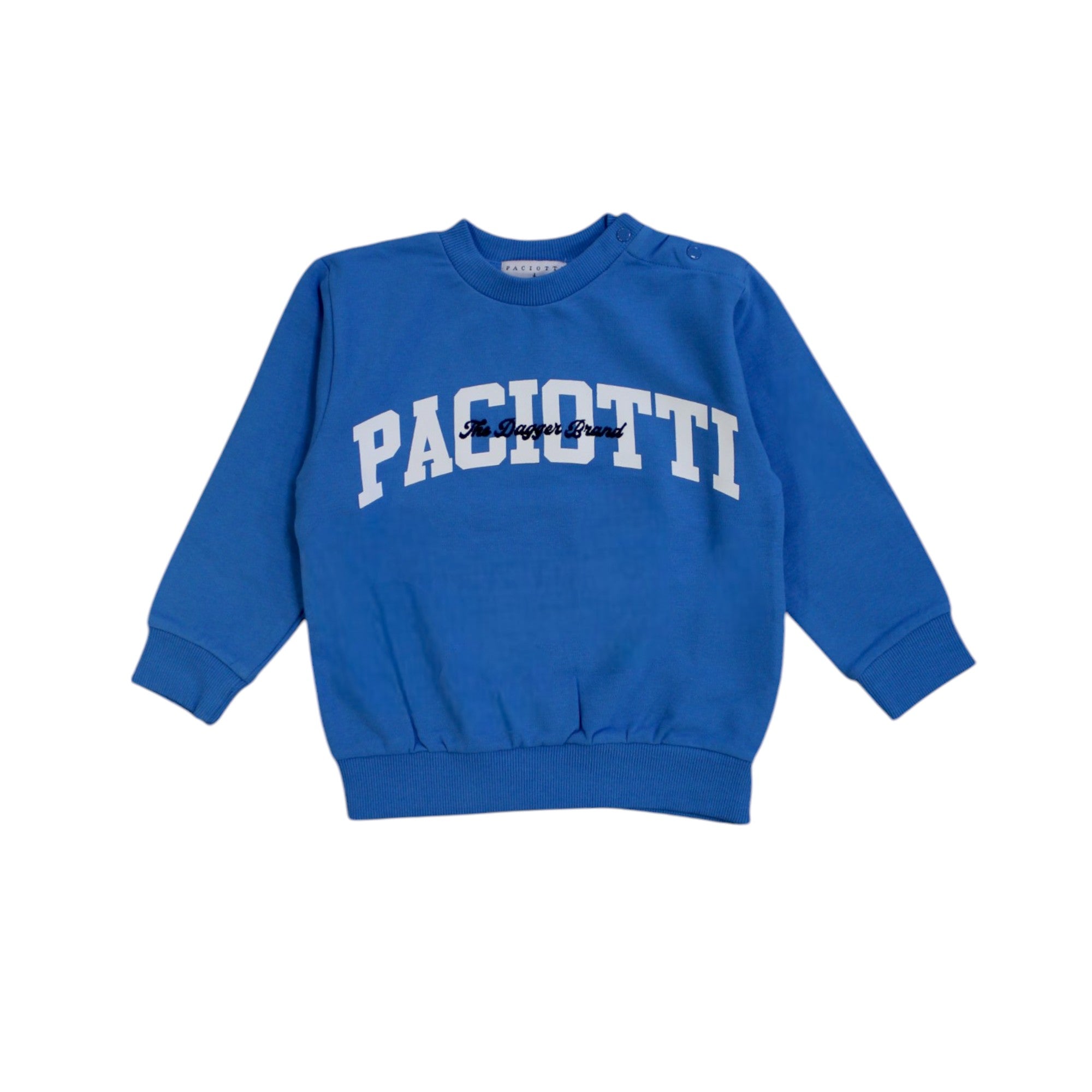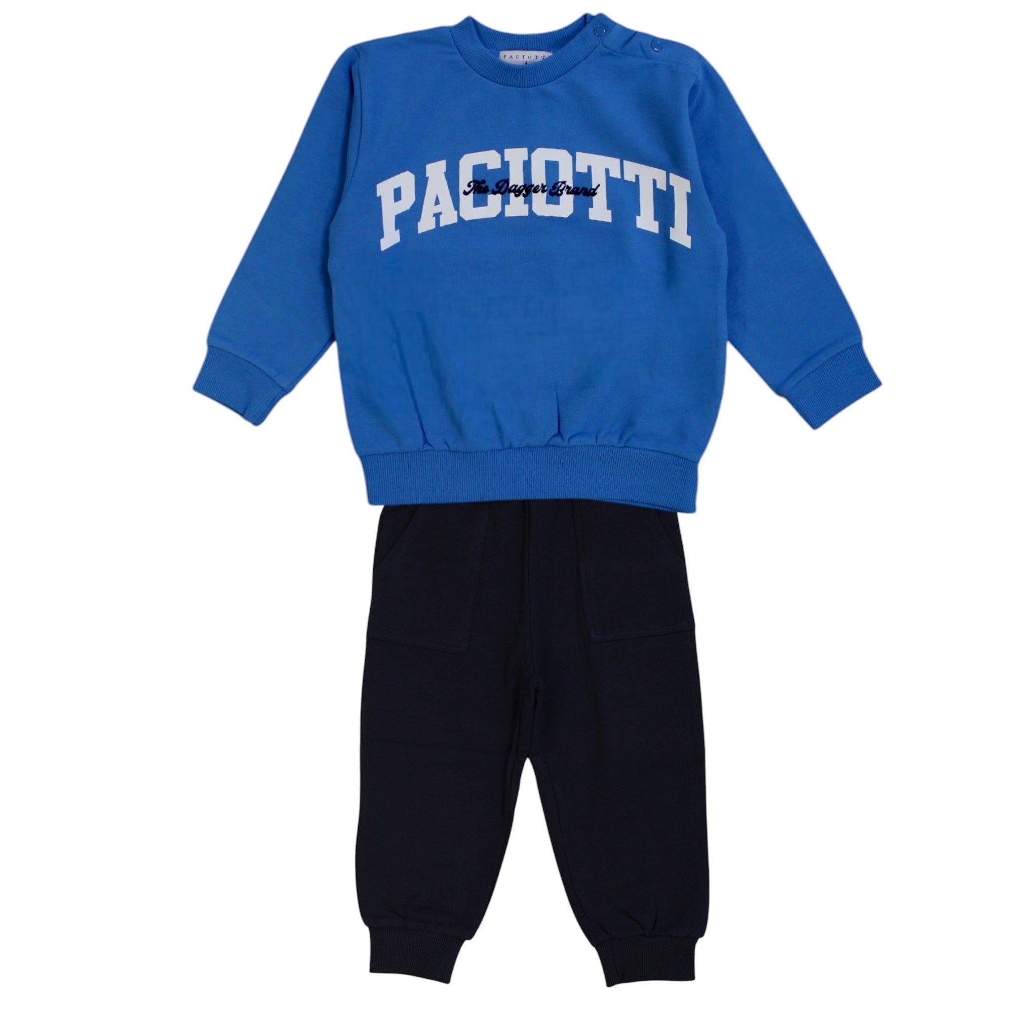 Completo composto da pantaloni jogger con elastico in vita, tasche a toppe, polsino in costa alla caviglia e felpa girocollo con finiture in costa, clips di chiusura sulla spalla, logo stampato in contrasto.
