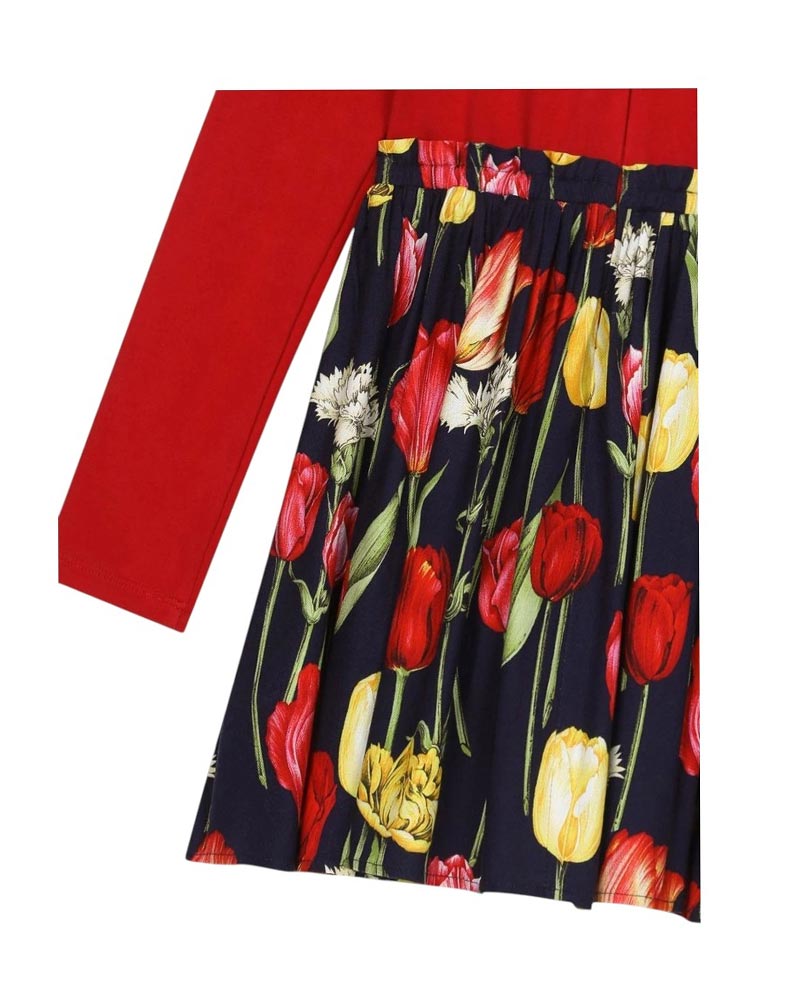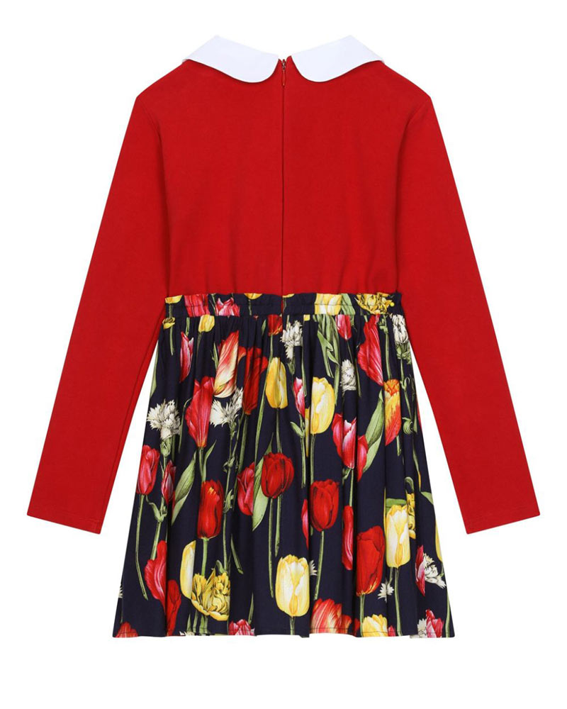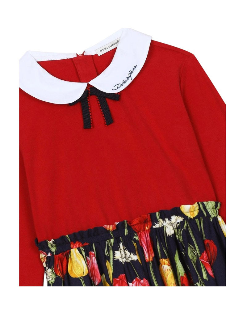 Abito a maniche lunghe da bambina. Presenta colletto bianco Peter Pan con logo ricamato, maniche lunghe, chiusura con zip nascosta sul retro, vita elasticizzata, gonna con stampa tulipano all-over. È decorato con fiocco sul davanti.
