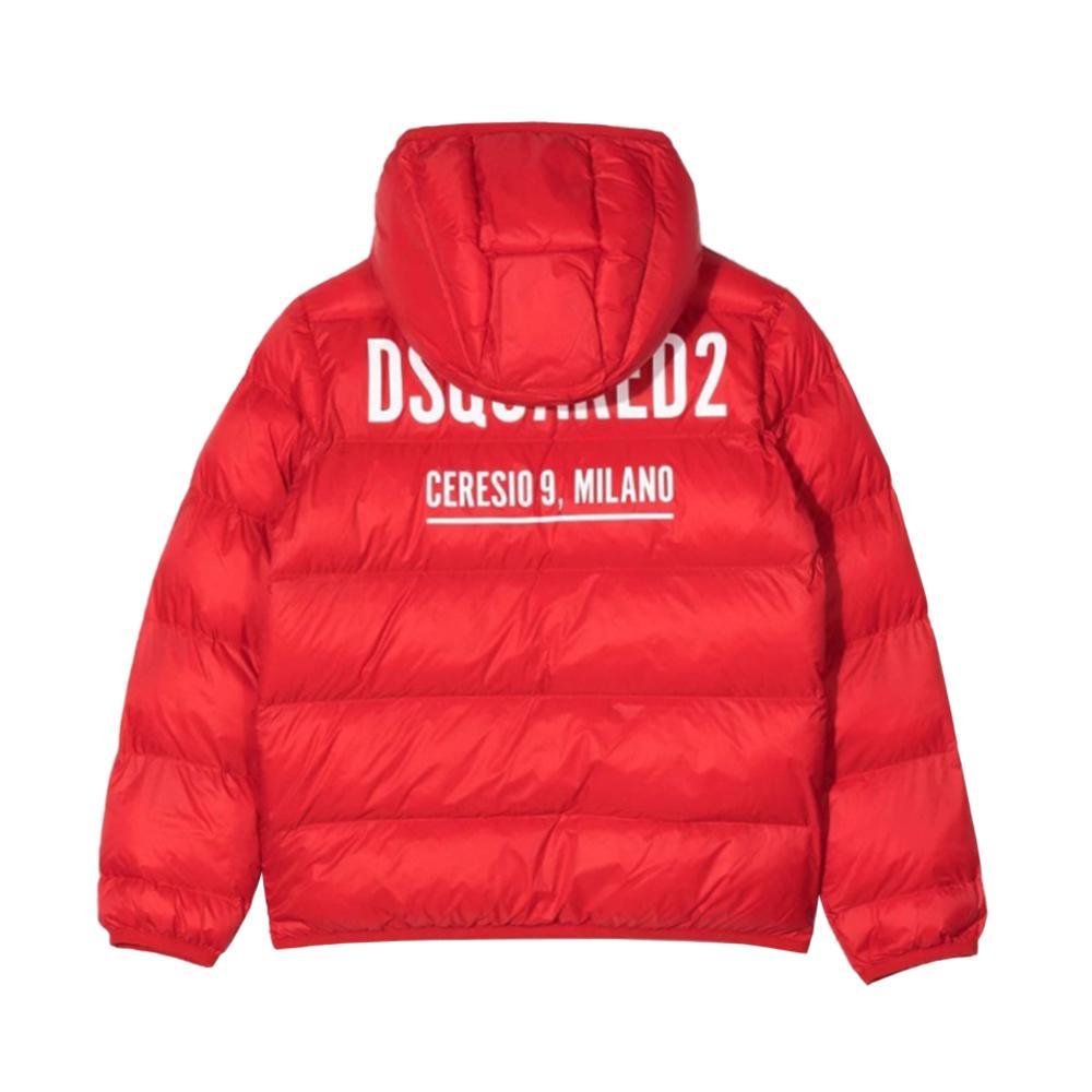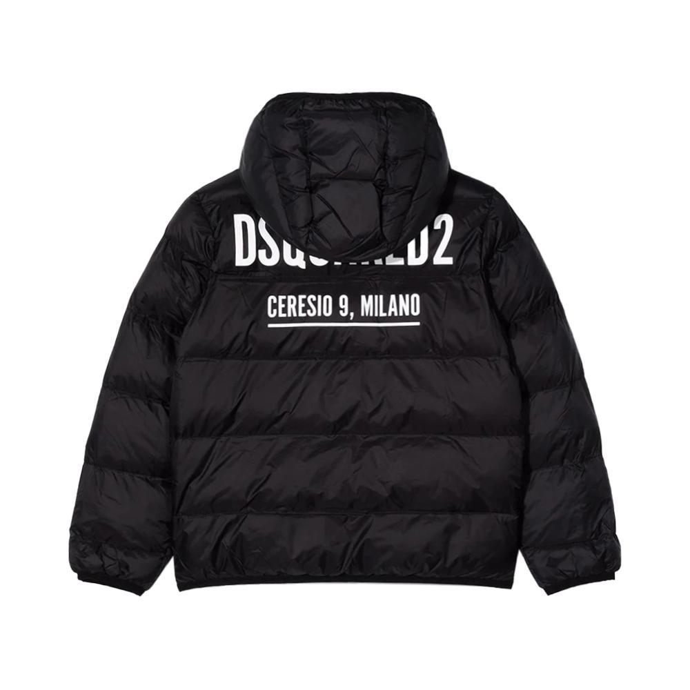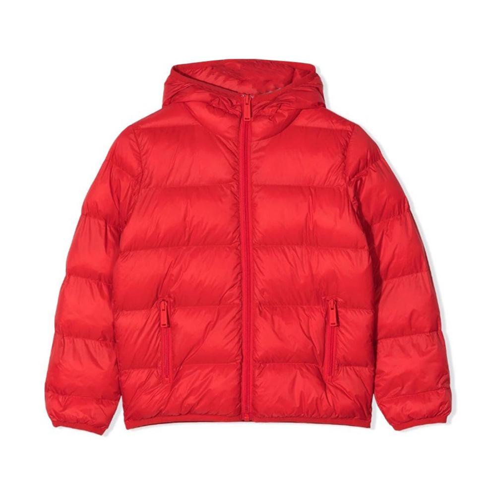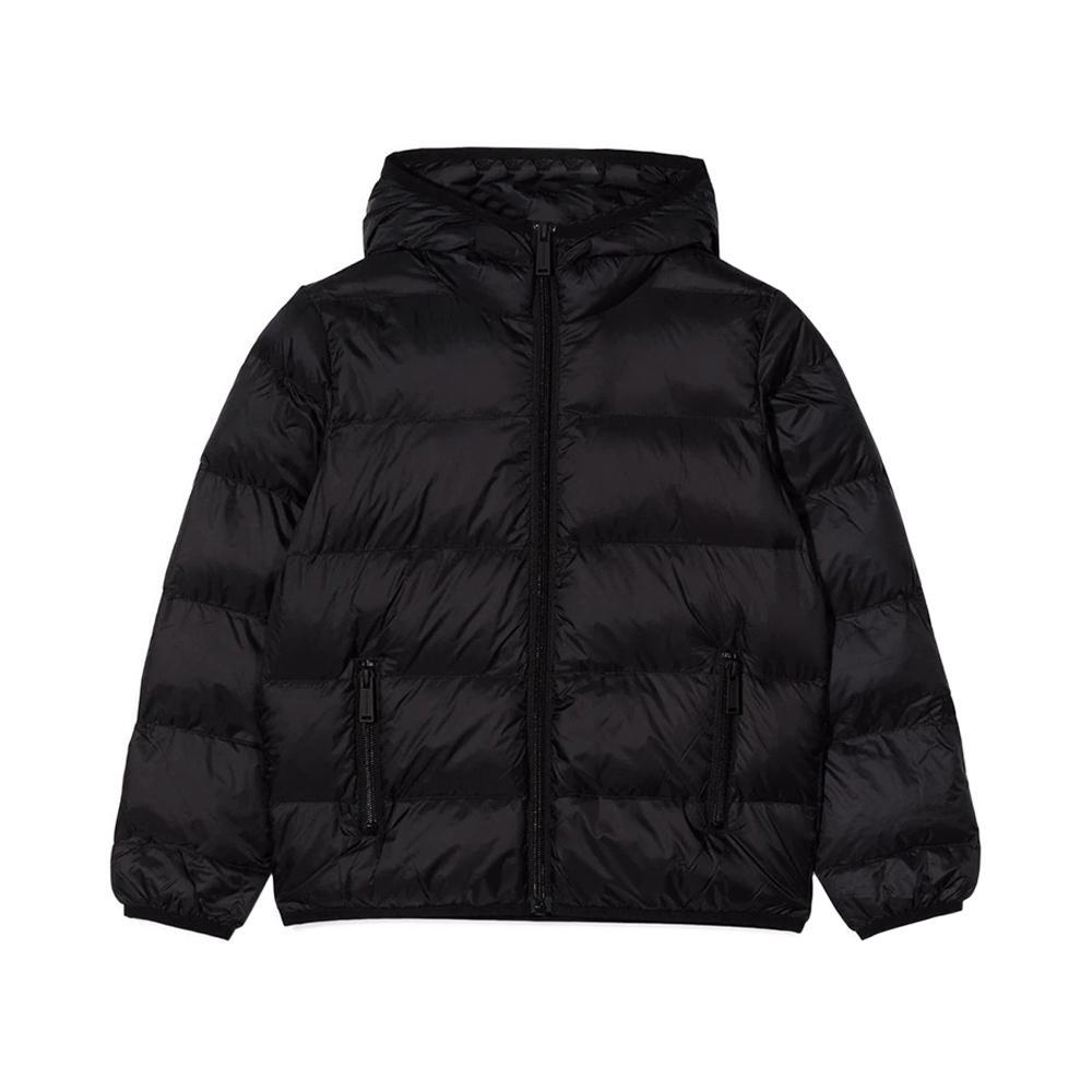 Gesteppte Nylonjacke mit Kapuze, Reißverschluss vorne, seitlichen Reißverschlusstaschen und Logodruck auf der Rückseite.