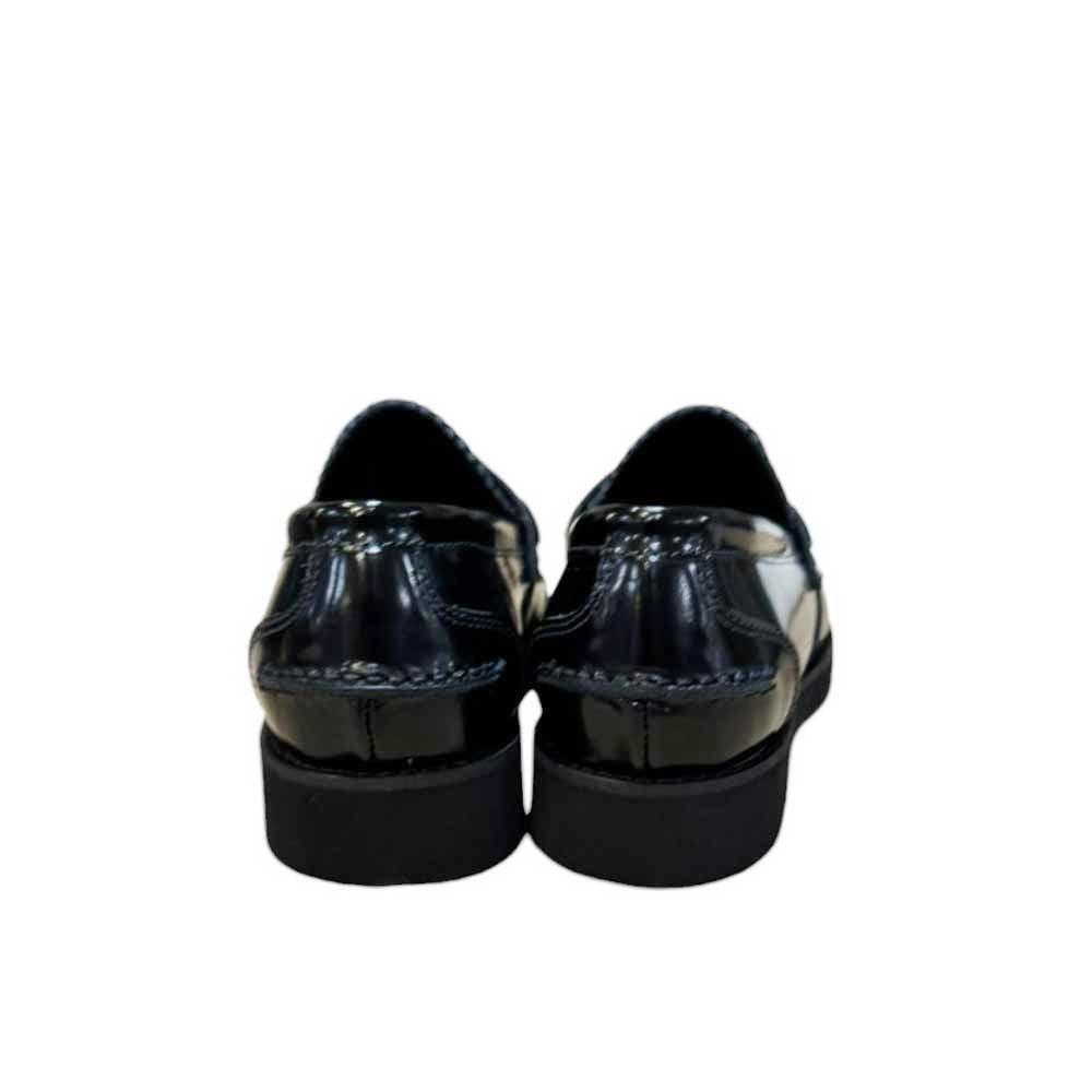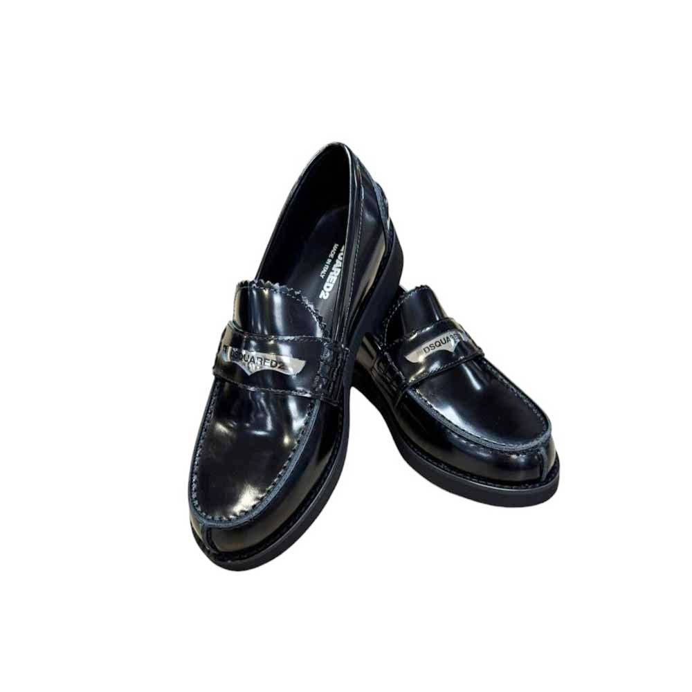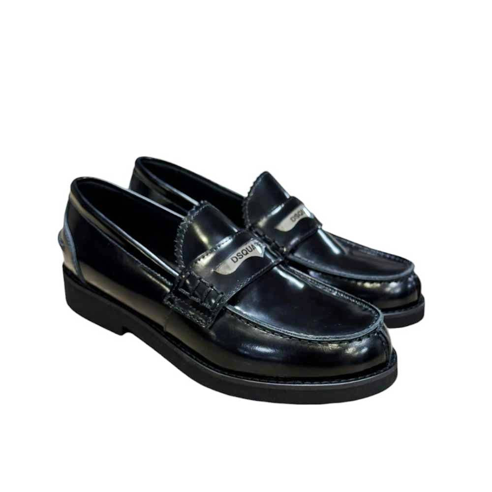 Schwarzes Kalbsleder mit glänzendem Finish, runde Zehenpartie, silberfarbenes Logo-Schild, Gummisohle, Slip-on-Design