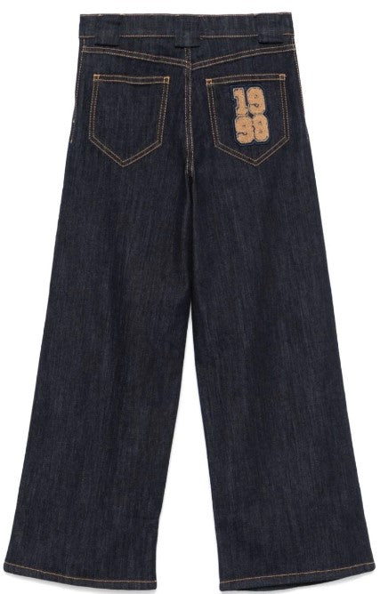 Palazzo-Hose aus Denim EFPA256.C von Elisabetta Franchi mit Knopfverschluss, Reißverschluss und Seiten- und Gesäßtaschen. Es verfügt über eine originelle Schwammstich-Applikation auf der Rückseite. Entdecken Sie den Komfort und den einzigartigen Stil dieser Hose.