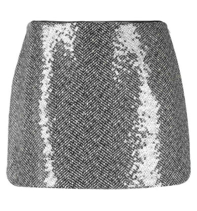 Hoch taillierter Minirock mit silbernen Pailletten, seitlichem Reißverschluss und geradem Saum.