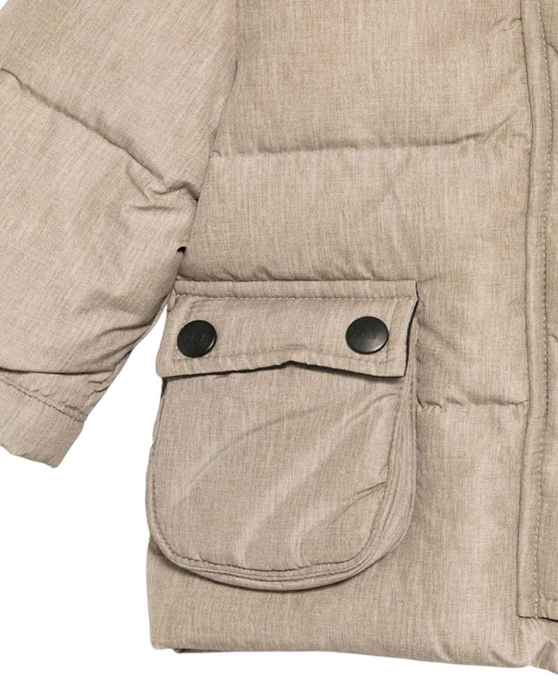 Giubbino imbottito beige da neonato. Presenta design trapuntato, cappuccio fisso, chiusura frontale con zip e alamari, maniche lunghe e due tasche con patta applicate sul davanti.