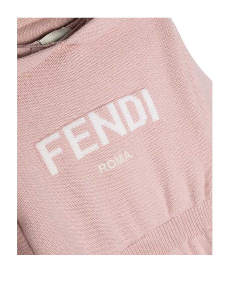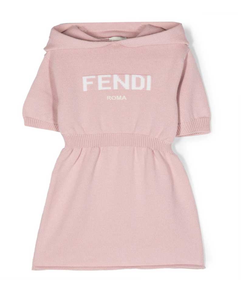 Abito Fendi Kids junior realizzato in 100% lana. Presenta maniche corte, cappuccio, elastico in vita, intarsio scritta Fendi Roma bianco sul davanti.
