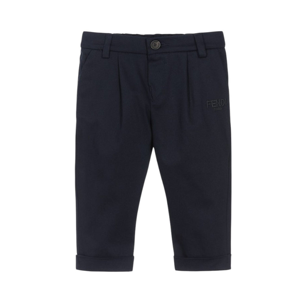 Pantaloni realizzati in gabardine di cotone. Presentano chiusura frontale con bottoncino, passanti per cintura, due tasche laterali all'americana e fondo con risvolti. Sono decorati con logo Fendi Roma ricamato tone on tone sul davanti e con inserto FF color tabacco sul retro.