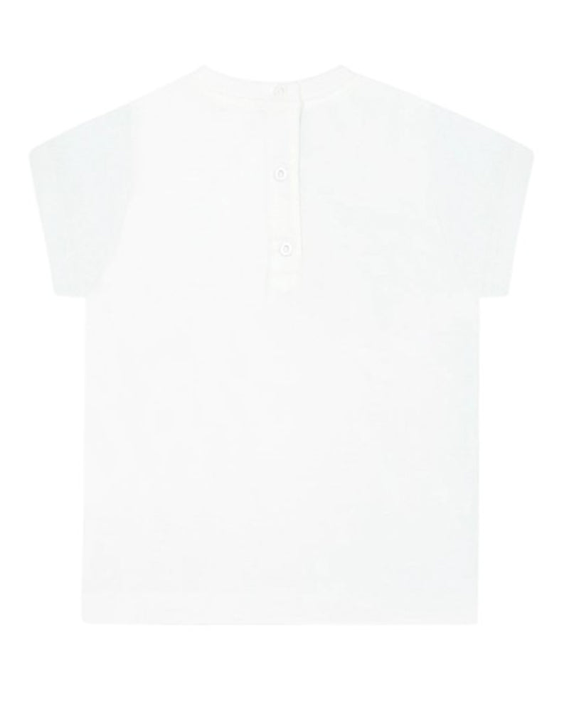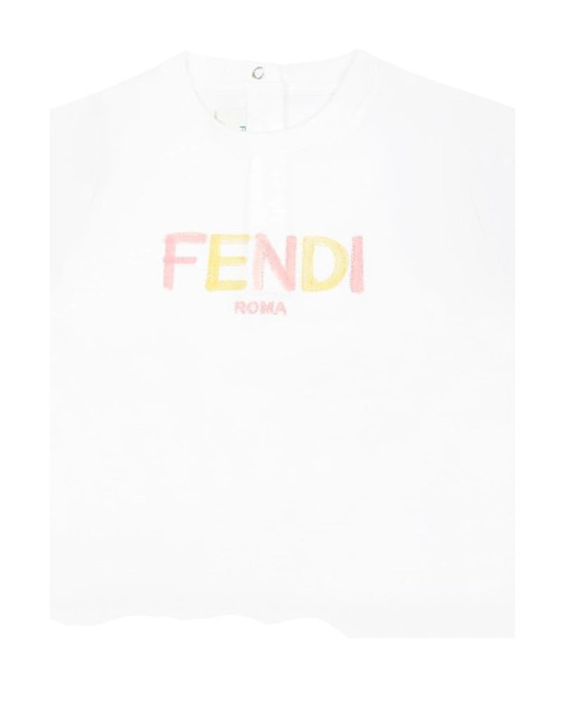 T-shirt baby in jersey bianco a maniche corte e ricamo Fendi multicolor nei toni del giallo e del rosa.