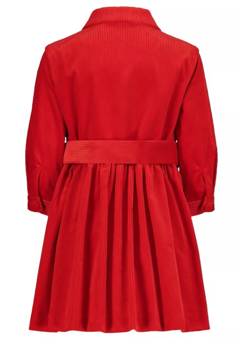 Gestreiftes Samtkleid, Knopfverschluss, Hemdkragen, aufgesetzter Gürtel mit Symbol.