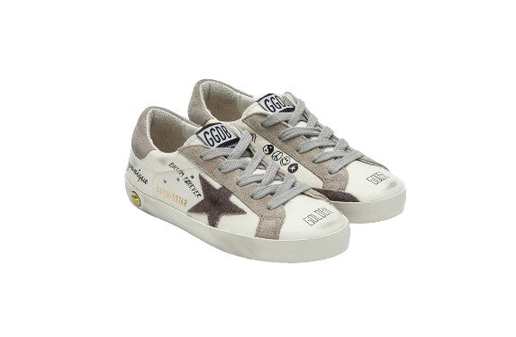 Niedriger Sneaker von Golden Goose Deluxe Brand aus weißem Leder, gekennzeichnet durch Schnürverschluss, kontrastierendes Lederdetail auf der Rückseite, abgerundete Spitze, Gummisohle und ikonischer Wildlederstern an den Seiten.