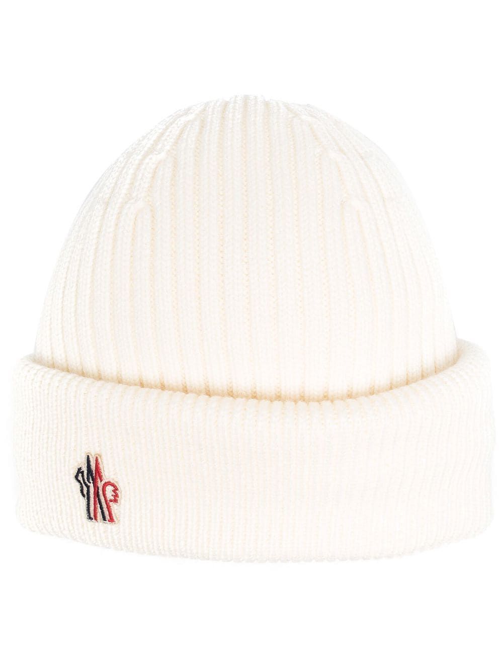 Weiße Mütze aus Schurwolle mit Daunenpolsterung und leichtem Stretch-Nylonfutter. Moncler-Patch auf der Vorderseite und geripptes Design.