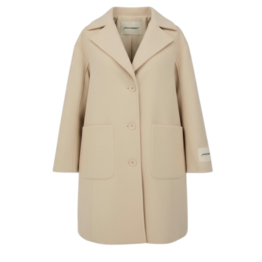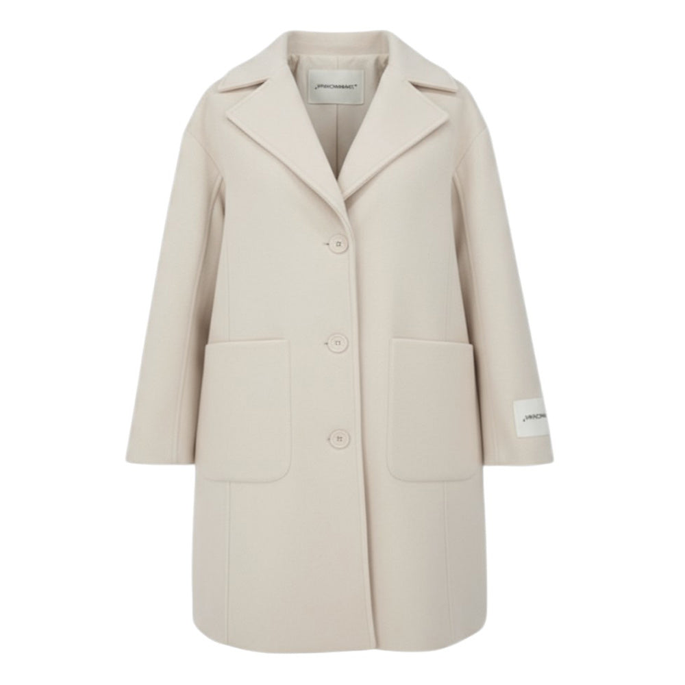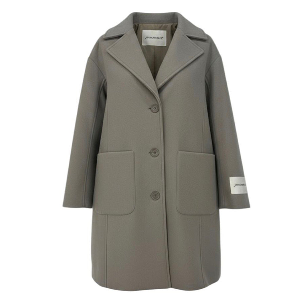 Einreihiger Wollmantel, Knopfverschluss, aufgesetzte Taschen, Logo-Patch am Ärmel.