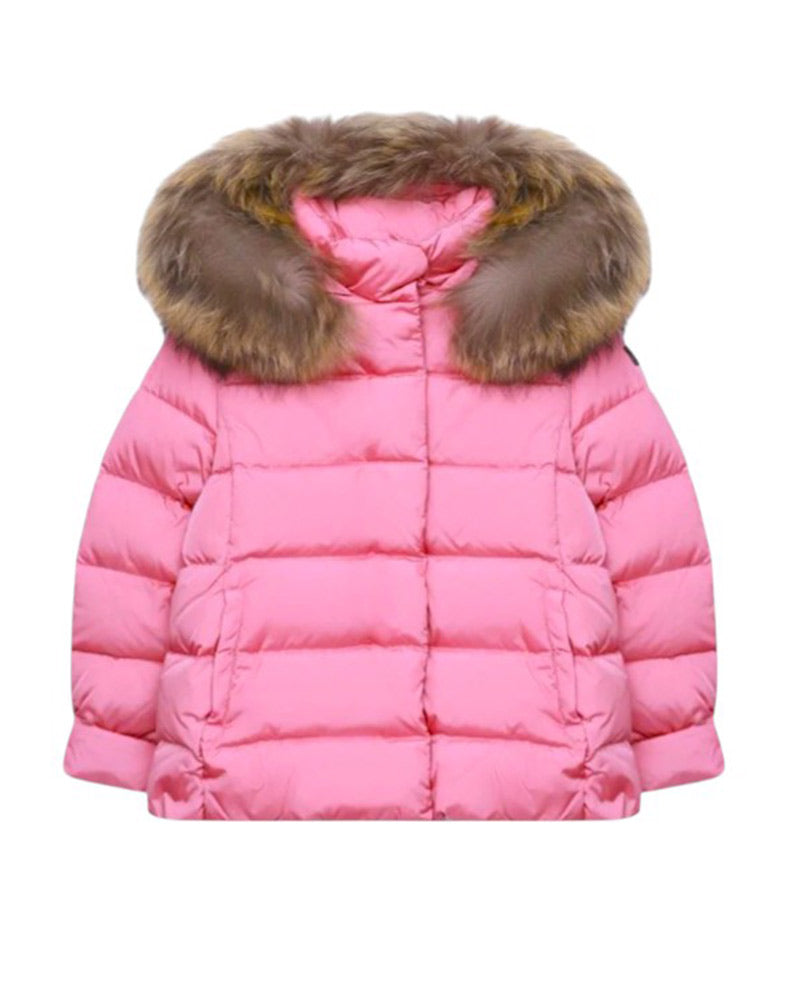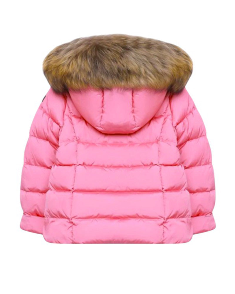 Giubbino imbottito da neonata, realizzato in nylon semilucido. Presenta design trapuntato, cappuccio rimovibile con bordo in pelliccia di procione, chiusura frontale con zip e bottoni a pressione, maniche lunghe e due tasche a filo laterali.