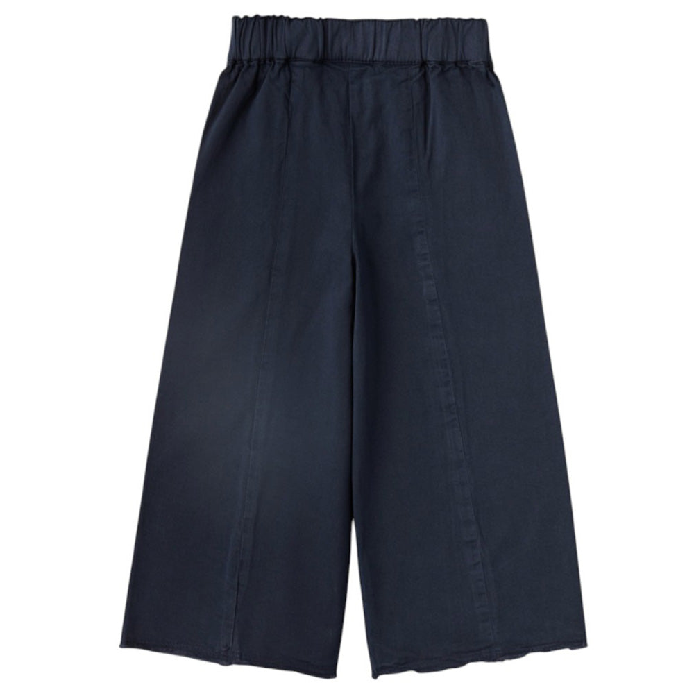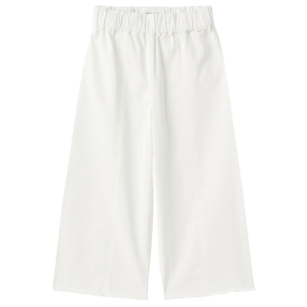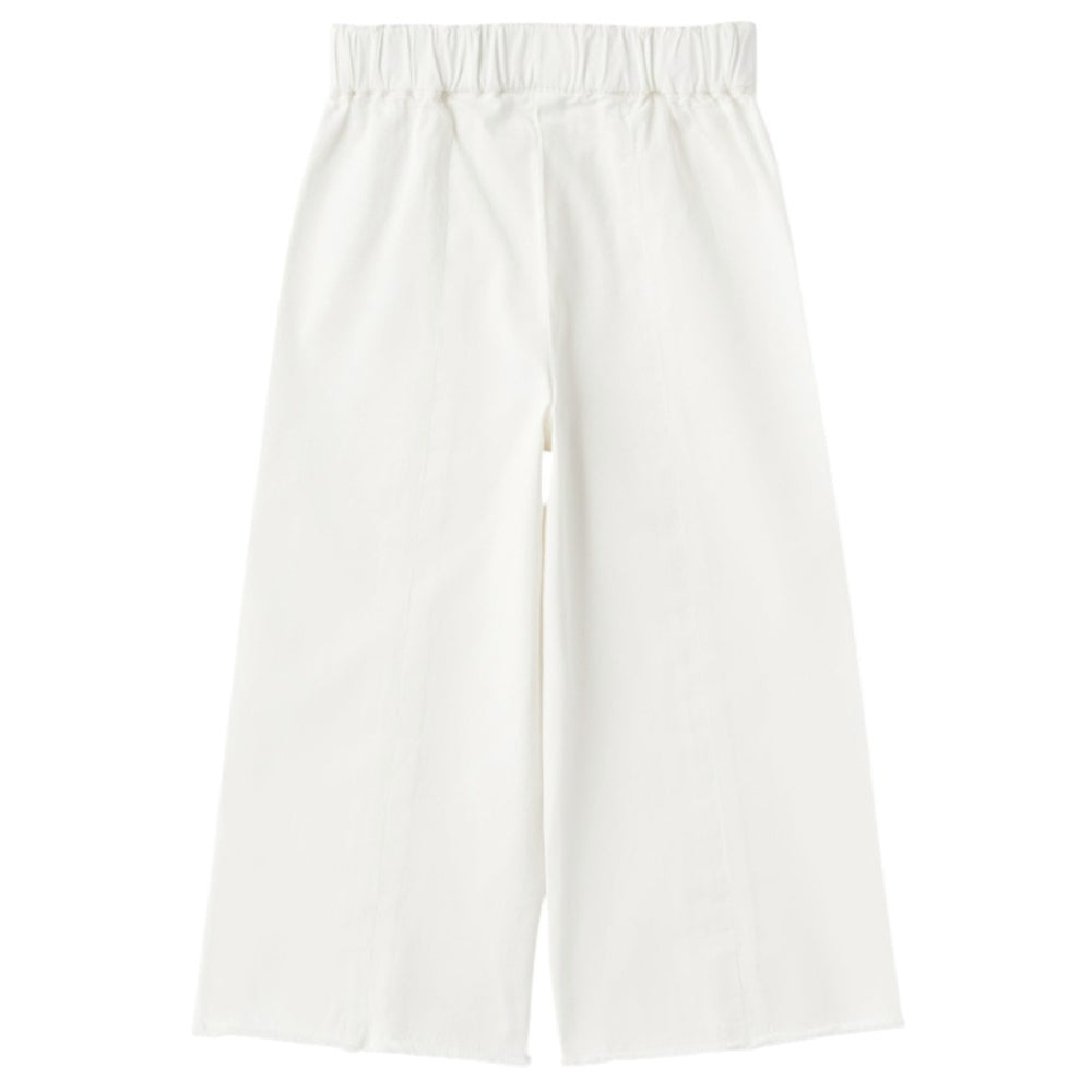 Pantaloni a palazzo realizzati in cotone, caratterizzati da vita elasticizzata, cuciture a vista e fondo gamba sfrangiato.