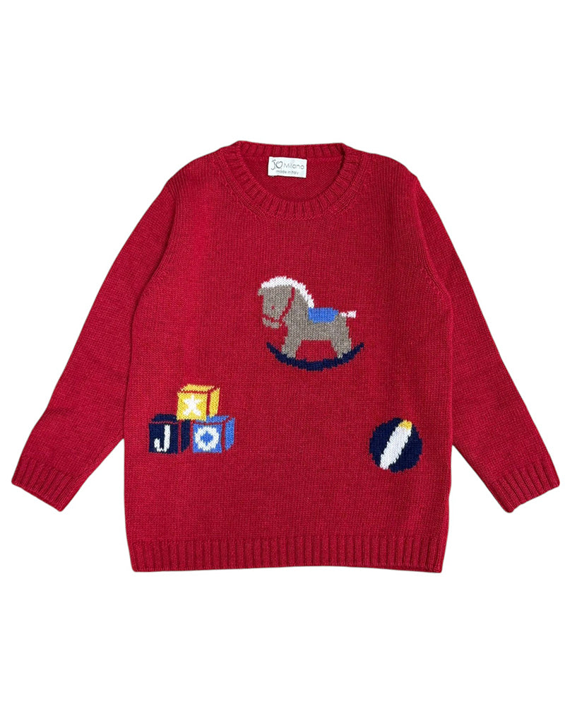 Maglia realizzata in misto lana da bambino. Presenta collo tondo, maniche lunghe, fantasia ad intarsio sul davanti e finiture a coste.