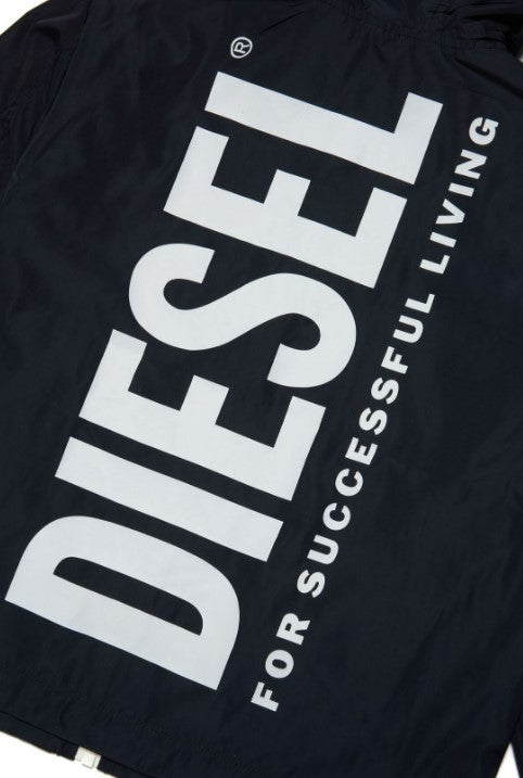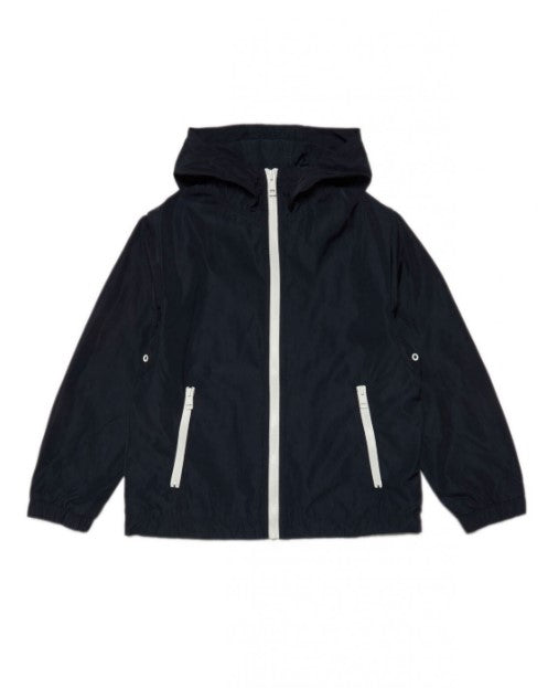 Nylonjacke mit Kapuze, Reißverschluss vorne, seitlichen Reißverschlusstaschen, Logo auf der Rückseite aufgedruckt.