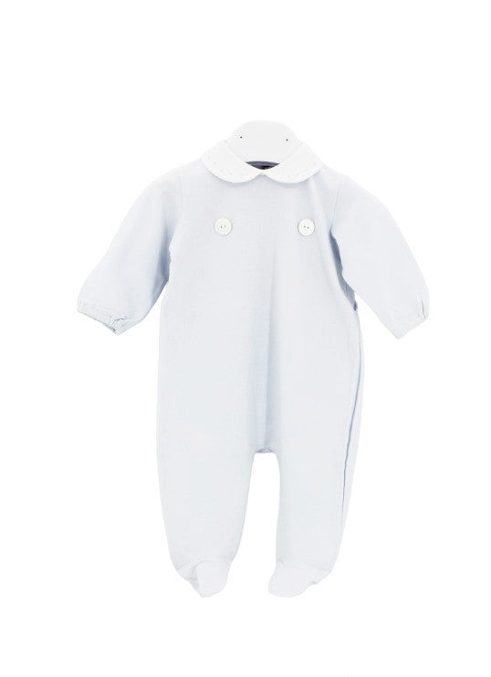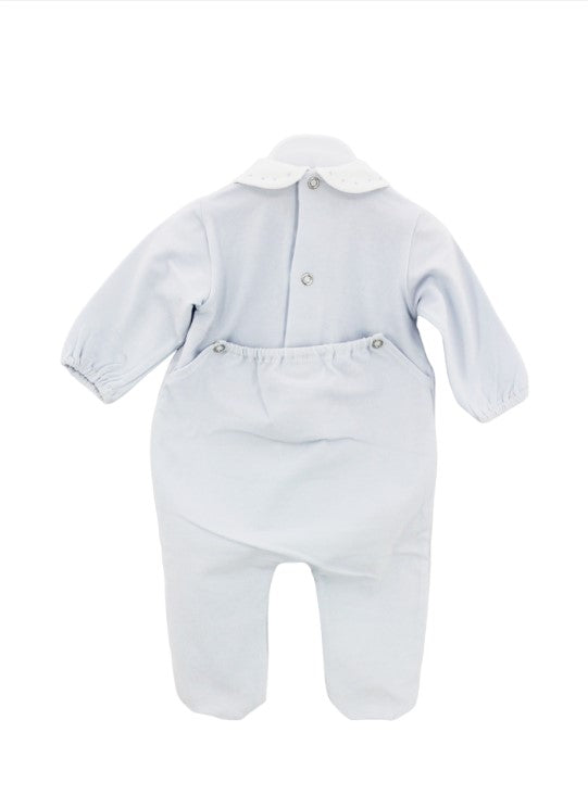 Strampler „Little Bear“ aus Sky-Baumwolle mit weißem Kragen und Knöpfen.