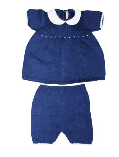 Kleines Bären-Outfit aus blauem Garn mit weißen Details.