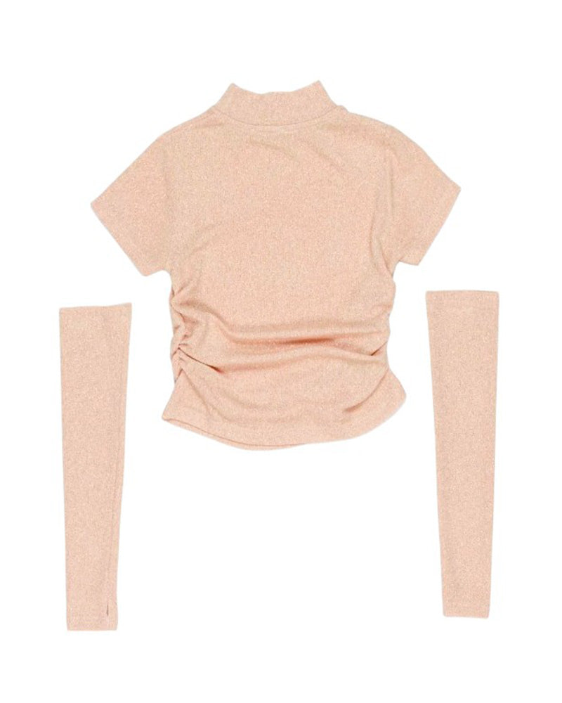 T-shirt realizzata in tessuto glitterato da bambina. Presenta mezzo collo, maniche corte con manicotti e arricciatura sui lati.
