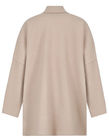 Beigefarbener Mantel mit langen Ärmeln, Kragen mit Revers, Knopfverschluss vorne und Seitentaschen mit Patte. Es ist mit einem auf den Ärmel gestickten Logo verziert.
