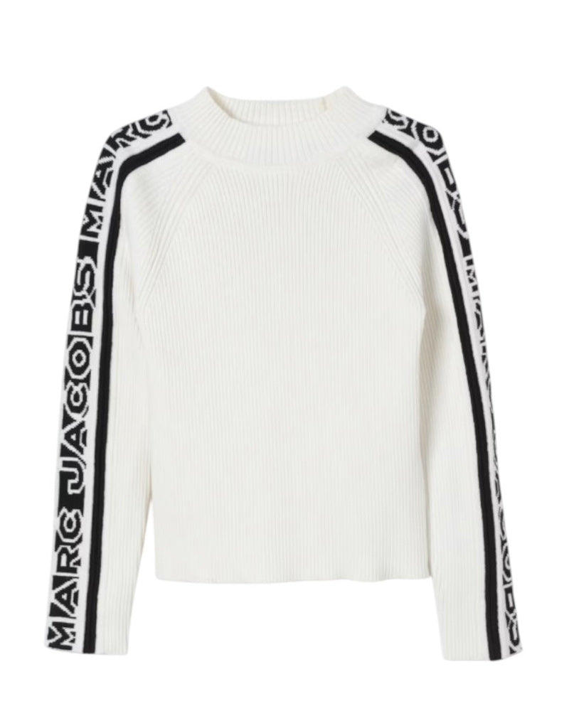 Maglia a coste realizzata in misto cotone e lana da bambina. Presenta mezzo collo, maniche lunghe con bande logo jacquard ad intarsio e orlo dritto.