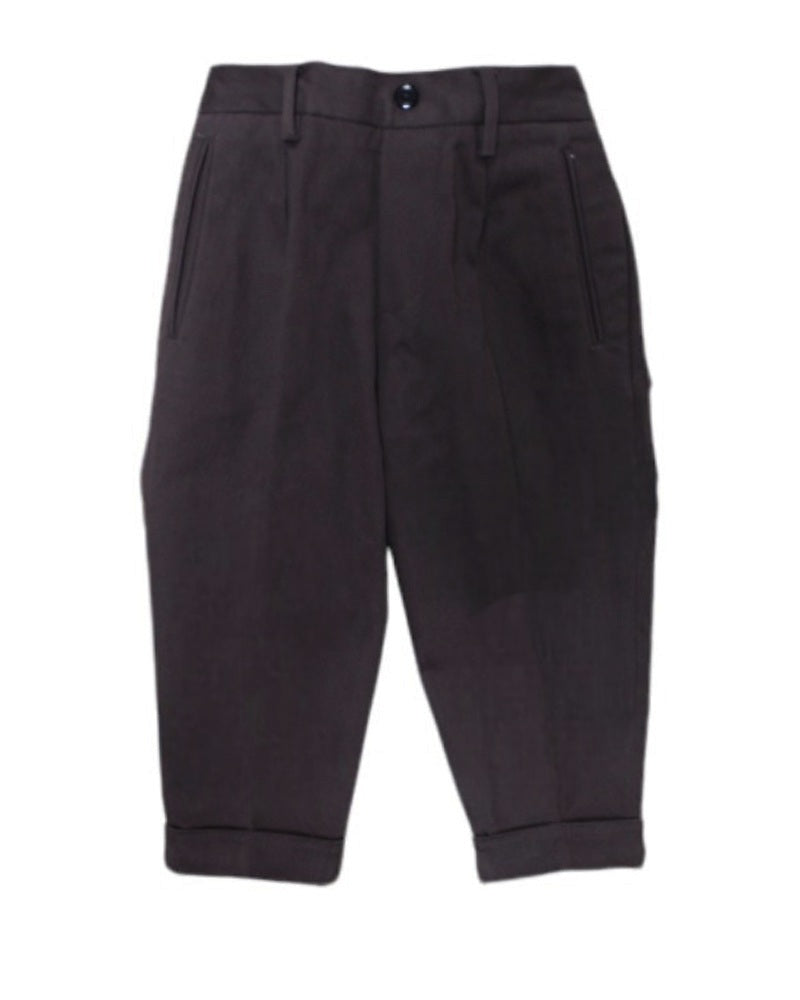 Hose mit französischer Falte, elastischem Bund, dekorativem Knopf, schrägen Taschen und Gesäßtaschen mit Patte.