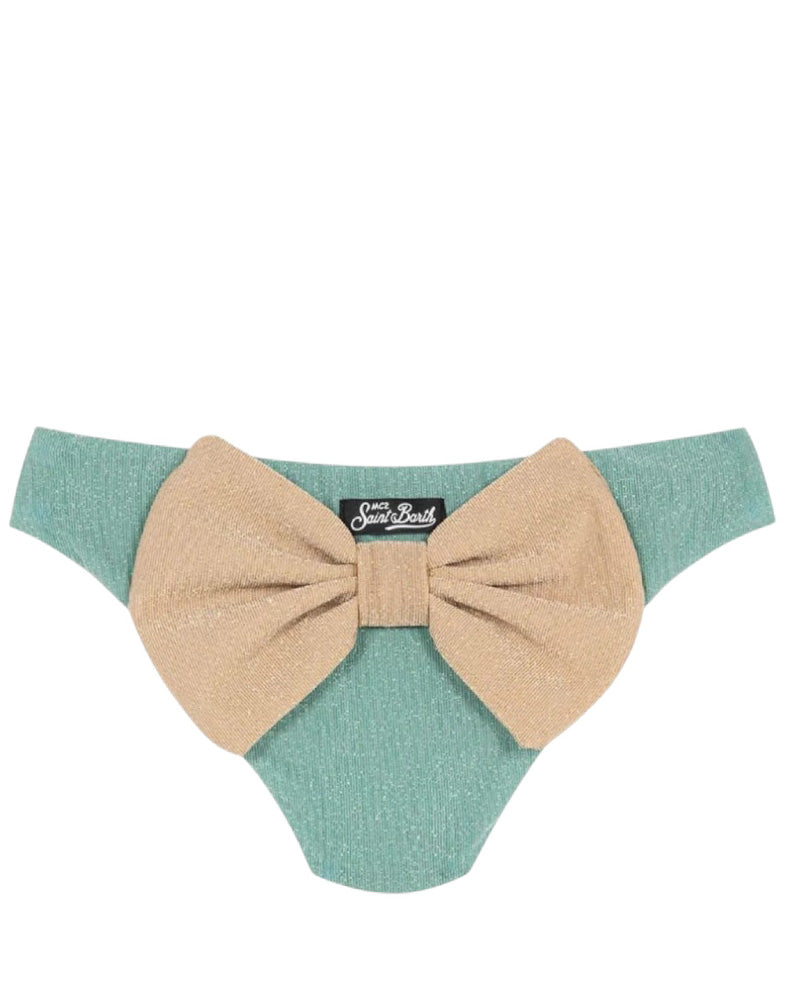 Slip mare Madame realizzato in lurex da bambina. È decorato con applicazione di fiocco dorato e patch logo sul retro.