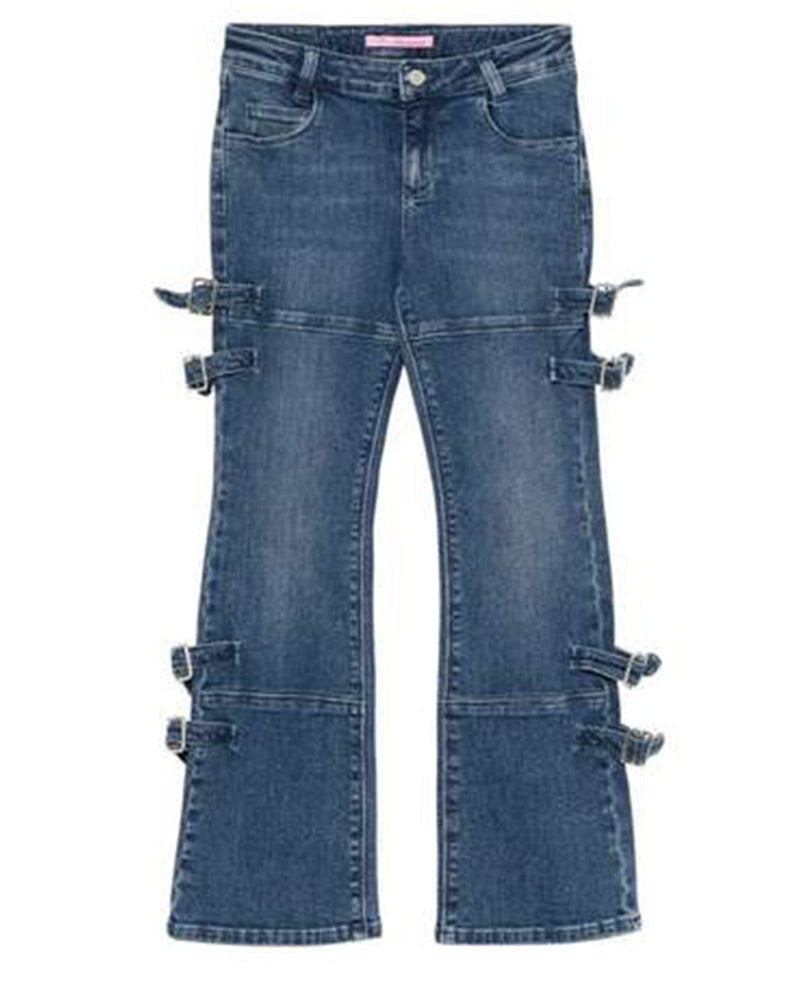 Jeans a zampa con fibbie realizzati in denim di cotone, modello cinque tasche. Presentano chiusura frontale con bottone e zip, vita regolabile grazie ad elastico interno con bottoni.